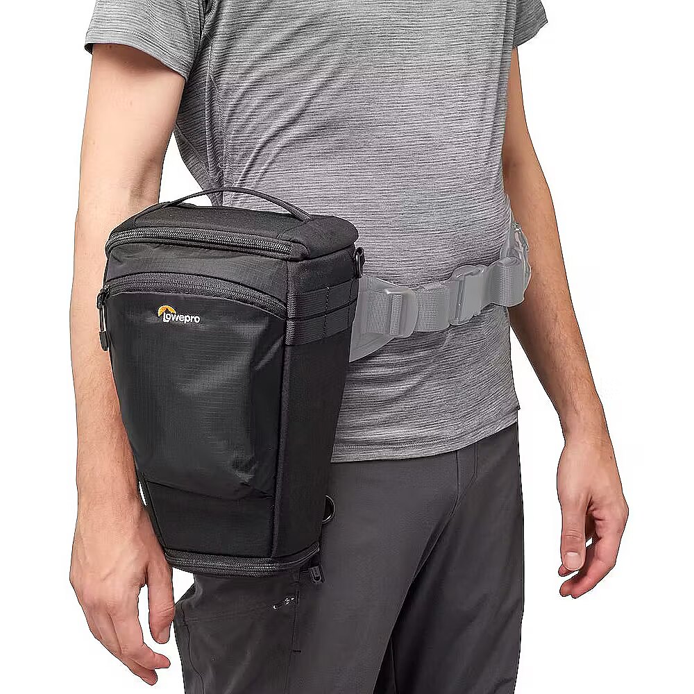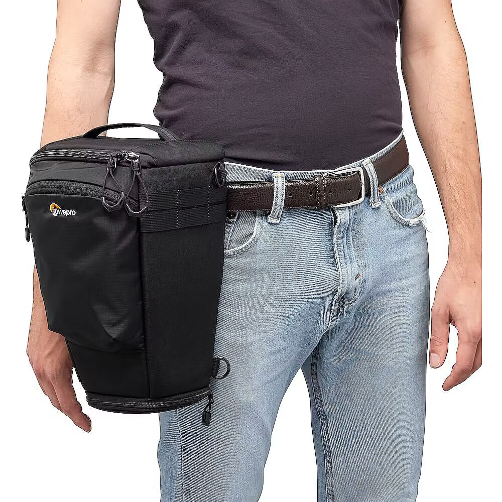 Introducing the ProTactic TLZ 75 Pro AW III, designed for the working photographer shooting events and other jobs all day, largely outdoors. This toploader is sized for a full-frame body with a portrait grip and up to a non-telescoping 70-200 f2.8 lens attached. The bag features an expansion section to accommodate a lens hood in shooting position, and the door wraps to the side for easier grip access. The quick-close buckle allows for fast access or extra security, while the interior divider holds the camera near the top for easy removal or divides the bag for a two-lens kit. Versatile Carry Options