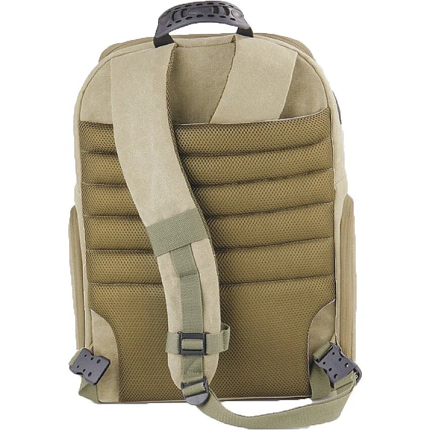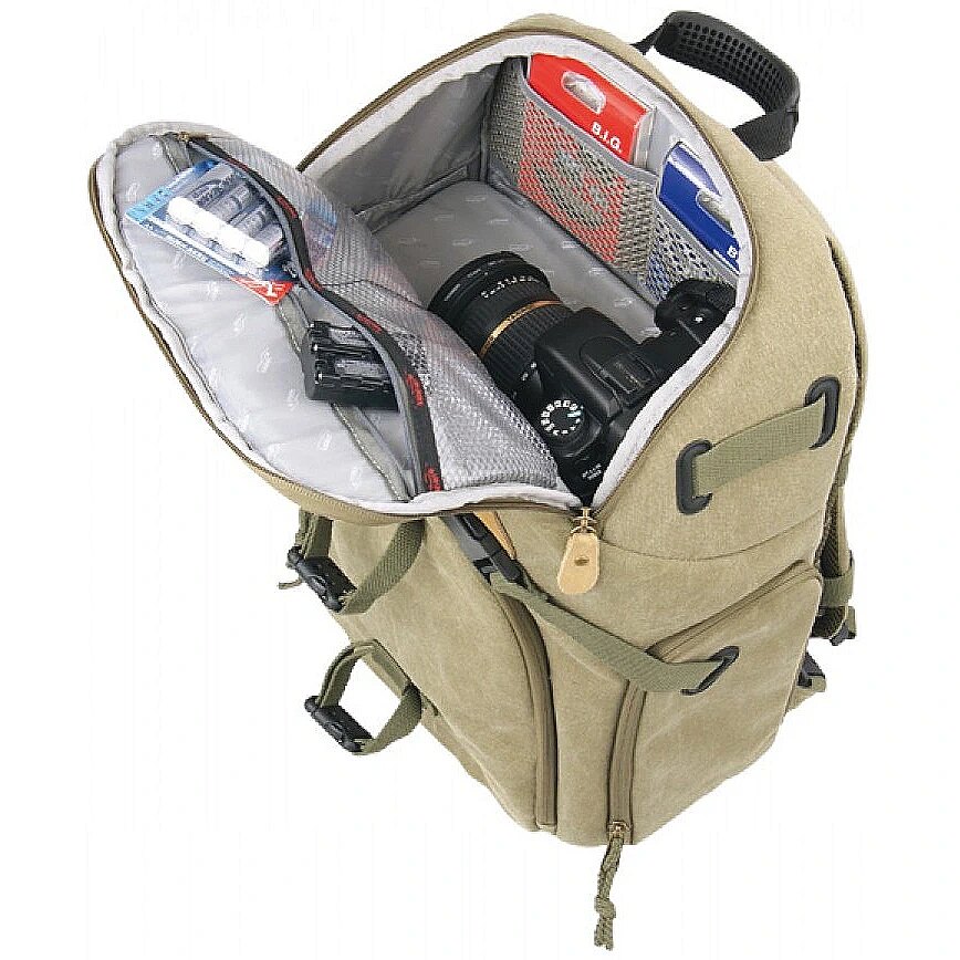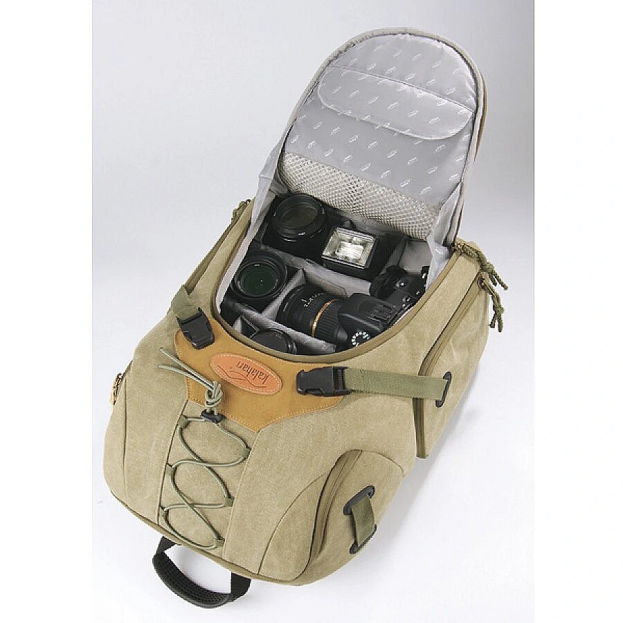 description_en - The Kalahari Kapako K-71 made of sturdy canvas is backpack and sling at the same time! So you can choose the method of wear individually. With two strap straps straight, it is portable as a normal backpack and with only one strap - which is then hung diagonally - as a sling optionally to wear over the left or right shoulder. The unused strap is simply stowed in the compartment between the back padding and the backpack. Both straps can be hidden there, ideal for transportation by car or plane. This avoids tripping hazards and protects the fasteners of the straps. The carrying function is taken over in this case by a comfortable and handy handle. The well-padded main compartment accommodates the photographic equipment, the spacious compartment in the top offers space for additional equipment, outdoor equipment, clothing or snacks. The compartment is so generously dimensioned that even cameras with mounted lenses still find room. Inner compartments also guarantee order and overview. Two side loops allow the attachment of other accessories such as cell phones, small compact cameras or lens quivers. Smaller tripods can be fixed with the two straps on the front cover. Longer or heavier tripods in addition to the fold-out tripod quiver. In case of bad weather or just for travel protection the enclosed rain cover protects.