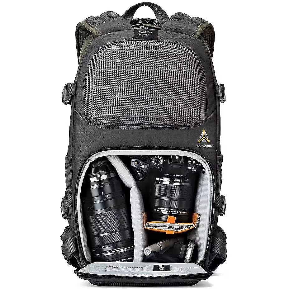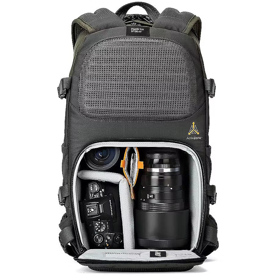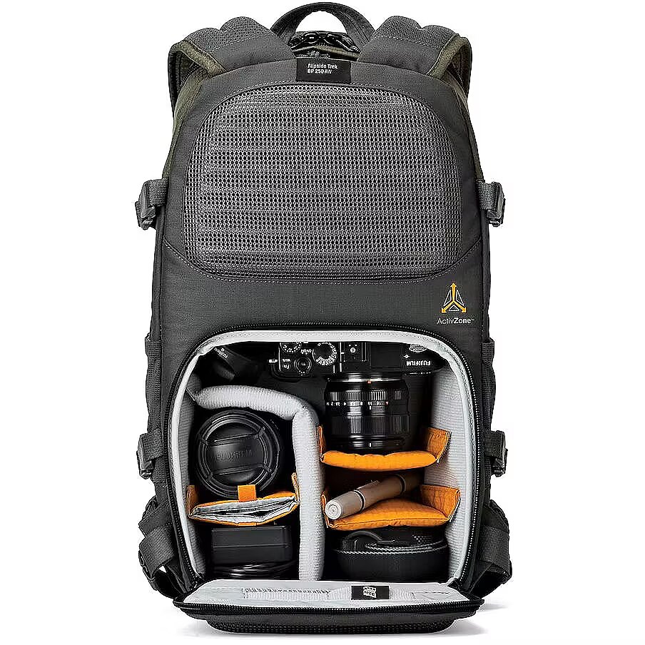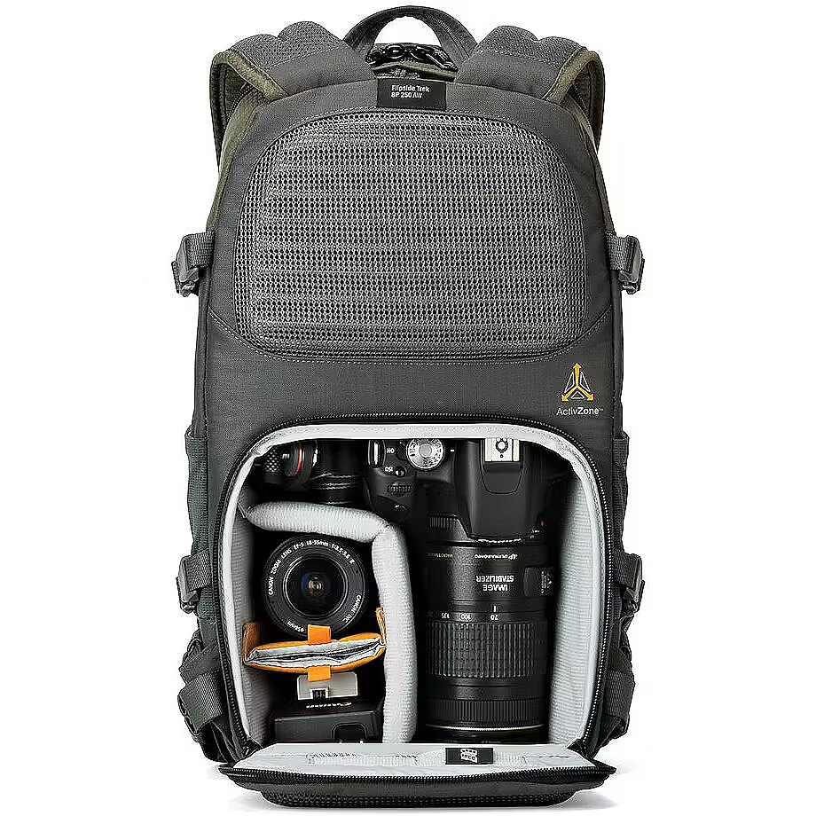 Carry a tripod, trekking poles, solar panel, water bottles, it's up to you. Flipside Trek provides all the mounting points you need to get the right gear to the right place at the right time. Carries a compact DSLR or mirrorless camera kit plus a tablet Flipside body-side access with hinged lid to camera compartment Split compartments - Open zone in top of pack for personal items ActivZone™ suspension system provides all-day wearing comfort Multiple attachment points to carry gear outside of your bag