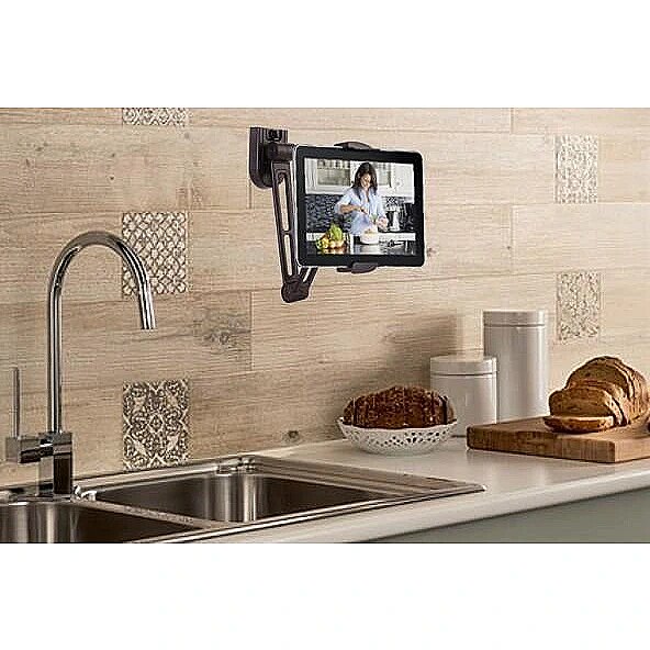 LongDesc - - Universal Stand for tablets and i-Pad- Can be wall mounted or on a flat surface under a cabinet- Adjustable mounting panel, compatible with tablets from 4.7" to 12.9"- The device may be arranged at various angles, in the horizontal and vertical- The adjustable arm allows for optimal viewing of the tablet- Includes a small bed for under-mounting or wall