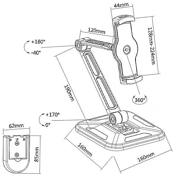 - Angle adjustment on the second joint: -40 ° - 180 °