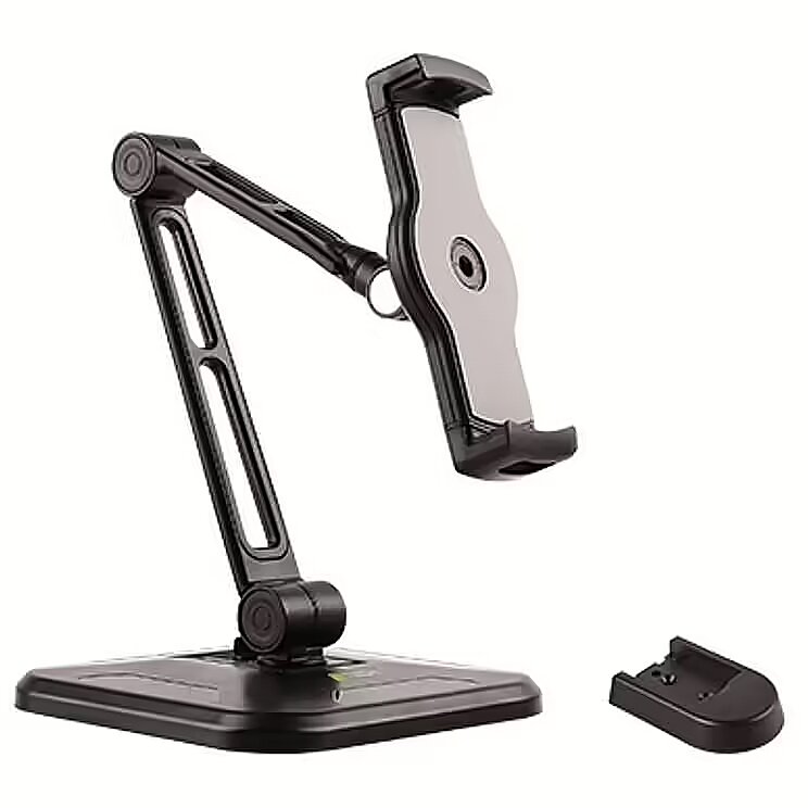 LongDesc - - Solid board universal stand for tablet and i-Pad- Ideal for tables, desks, kitchen counters, trays of seats on the plane and any other flat surface- Adjustable mounting panel, compatible with tablets from 4.7" to 12.9"- The device may be arranged at various angles, in the horizontal and vertical- The adjustable arm allows for optimal viewing of the tablet- Stable steel base 160 x 160 mm- Includes a small optional basis for under-mounting or wall