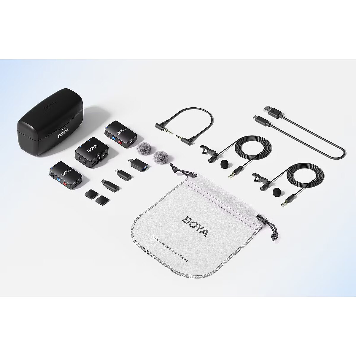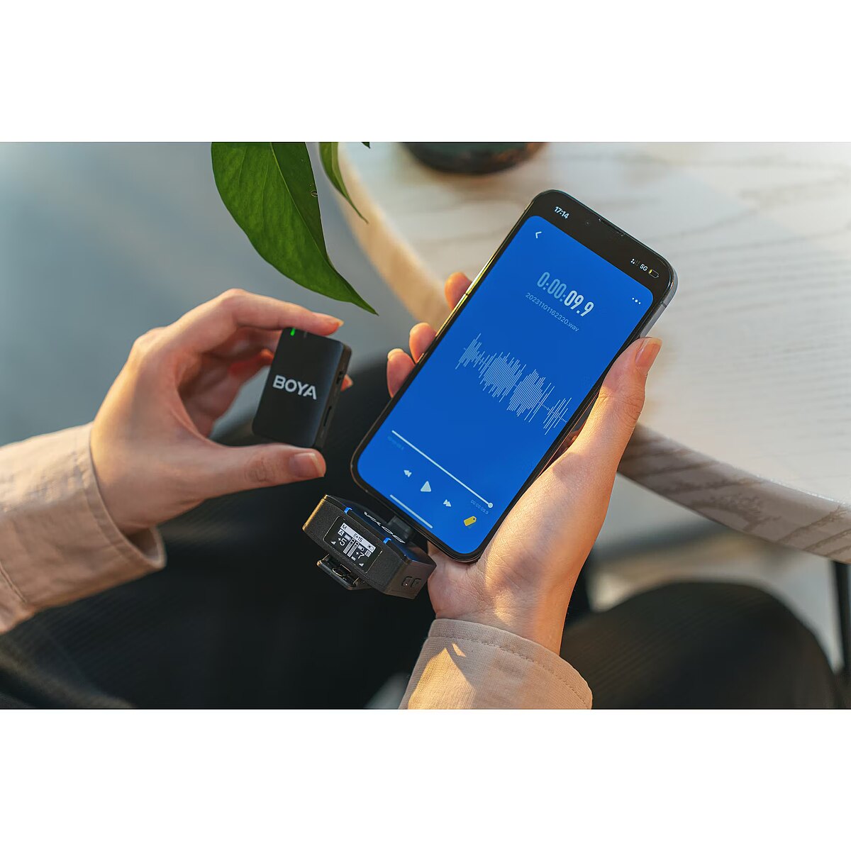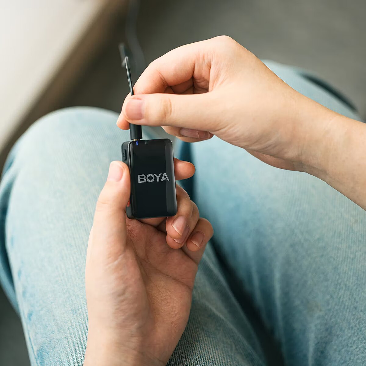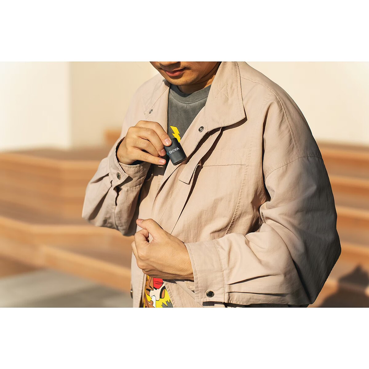 description_en - The BOYAMIC is a portable 2.4GHz wireless microphone system. It features high-performance noise cancellation, which is available for improving the recording effect in a noisy environment. It also boasts a remarkable onboard recording which is available for storing your recording files in real-time. The BOYAMIC is perfect for live streaming, vlogging, mobile journalism, and more. What's more, equipped with a low-cut filter, the wireless microphone can eliminate unwanted low-frequency noise (75Hz/150Hz or lower) in your recording. The BOYAMIC is a versatile 3in1 solution compatible with most recording devices. Simply plug it into iOS/Android phones, cameras, or computers without any transfers or learning curves. All-in-one wireless microphone system for cameras, computes and smartphones 8 GB memory storage & up to 15 hours of recording Wide-range 20–20 000 Hz frequency response – deliver exceptional high-quality sound Separate noise cancellation control – 48 kHz/24 bit HD audio format retained Up to 10 hours of operating time (about 6 hours when the onboard recording is enabled) Rechargeable up to 1,5 times with the charging case Up to 300 meters of wireless transmission Comes with a windproof capsule – minimize unwanted wind noise The transmitter can be attached to your clothes with the included magnet Rotating clasp-type fur windshield does not fall off easily Receiver’s 3.5mm headphone output – monitor your audio in real-time or playback audio