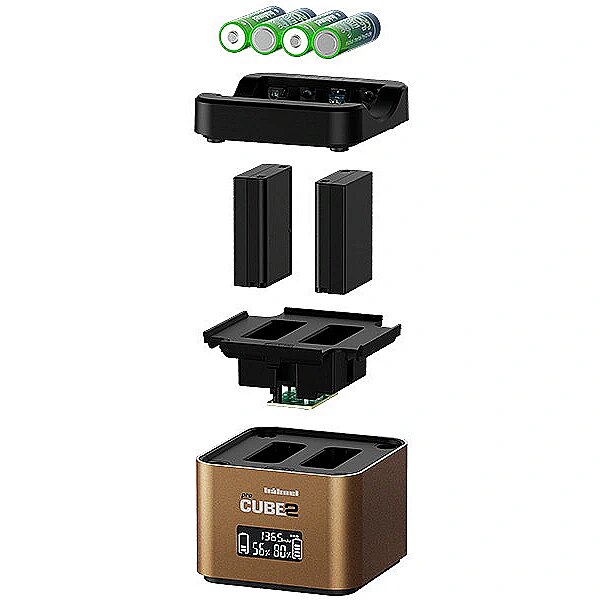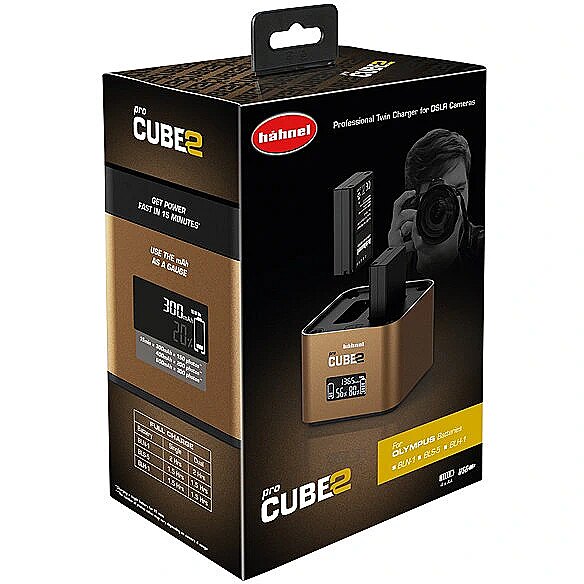 description_en - The professional ProCube2 charger with a 2-bay charger can charge two lithium-ion batteries simultaneously. The charger also features a charging plate for four NiMH batteries. Previous wired plate replaced with a user-friendly cable-less version Top-up charge – new mAh reading shows how much capacity has bee added during charging (300 mAh = approximately 150 photos) High-end LCD display with improved visibility Battery health check Charges one or two batteries simultaneously Charging time 150 minutes Intelligent fast IC charge control Supplied with interchangeable UK, Euro and US plugs 12V Car lead included Integrated 2.4A USB charger AA tray charges 4 AA batteries simultaneously Compatible with the following Olympus batteries: BLN-1 BLS-5 BLH-1