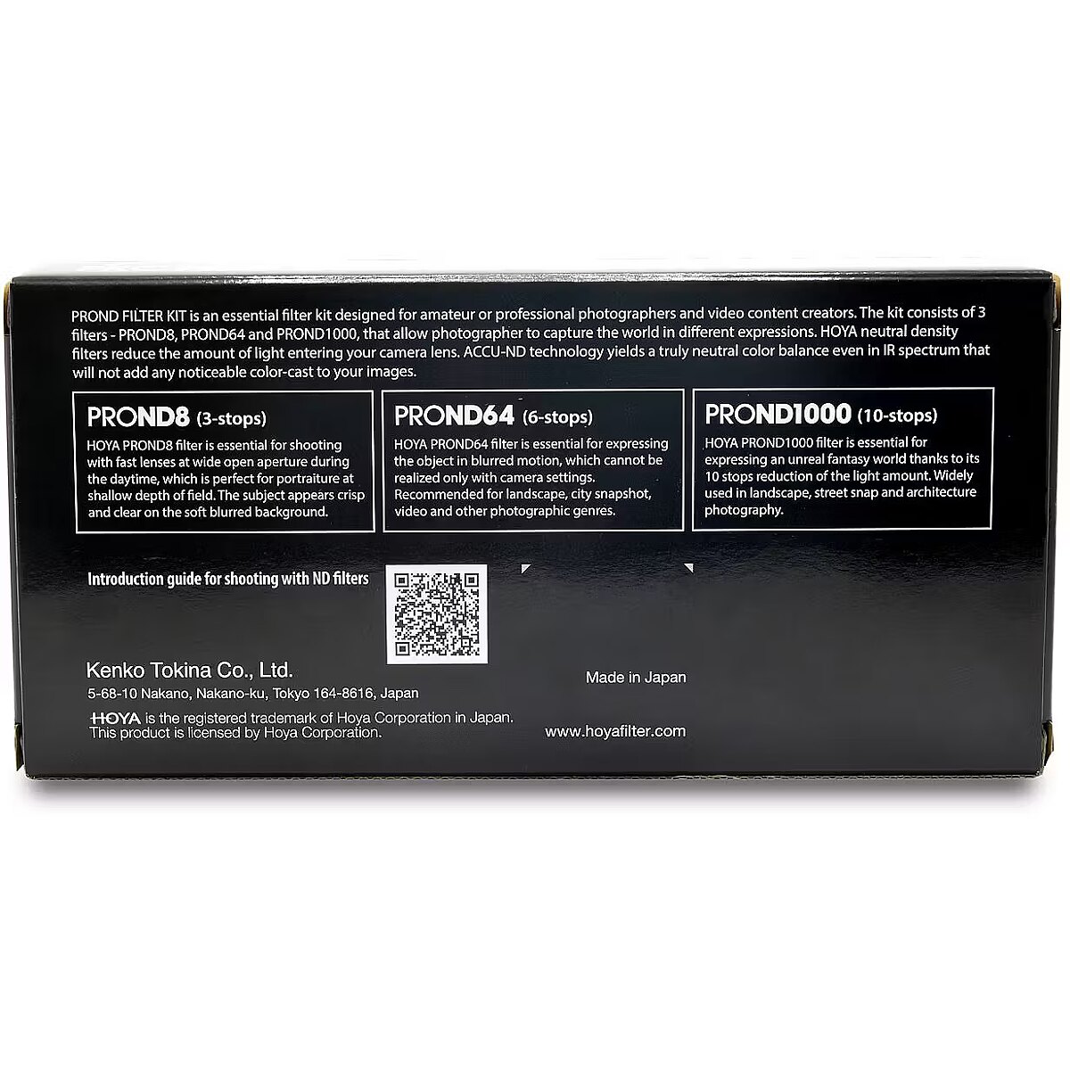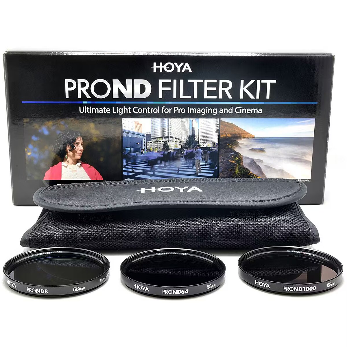 description_en - Practical Hoya filter kit includes: Hoya filter ND1000 Pro 58mm Hoya filter ND64 Pro 58mm Hoya filter ND8 Pro 58mm Filter pouch HOYA PROND Filter Kit is an essential filter kit designed for amateur or professional photographers and video content creators. The kit consists of 3 ND filters - PROND8, PROND64 and PROND1000, that allow photographer to capture the world in different expressions. PROND8 (3-STOPS)