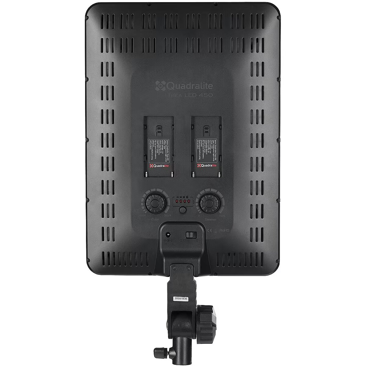 description_en - Extremely strong light output of 3650 lux High color rendering index CRI>95 Color temperature of 3200–5600 K ±300 K Built-in soft diffusion layer Smooth brightness adjustment within the range of 10–100% Compact sizes and weight Large light-emitting surface area Battery charge level indicator No flickering effect Intuitive control Quadralite Thea 450 LED Panel is designed to fill a large area with soft, studio light. Its key feature is a large light surface which combined with the high power of the panel, guarantees a perfect light filling of the scene, so you can get a professional effect on your photographs or videos. This panel combines high light output with low weight (only 1403g) and depth (only 6cm) which makes it easy to transport and place it in any, even small studio space. The Thea 450 LED panel is equipped with a dedicated diffusion surface thanks to which the light emitted by the lamp is extremely soft, thus eliminating the harsh shadows on the objects. With this lamp, you will achieve a fully professional studio effect without any additional light modifiers. The lamp is made of LEDs with high CRI>95 colour rendering index. The panel emits a strong beam of light without any flicker effect, with the possibility to adjust the lamp's colour temperature in the range of 3200K-5600K (±300K) using a dedicated knob on the back of the panel. This function will allow you to adjust the lamp's light to the existing light, thus achieving a natural effect on your recording. With a built-in mount point equipped with a ¼ inch thread, you will be able to mount the lamp to your existing mounting systems such as tripods or brackets. The power supply of Thea 450 LED panel is possible thanks to two popular batteries type NP-F guaranteeing long lamp operation and dedicated AC power supply included in the kit. Box includes Quadralite Thea 450 panel LED Mount with ¼" thread AC power adapter