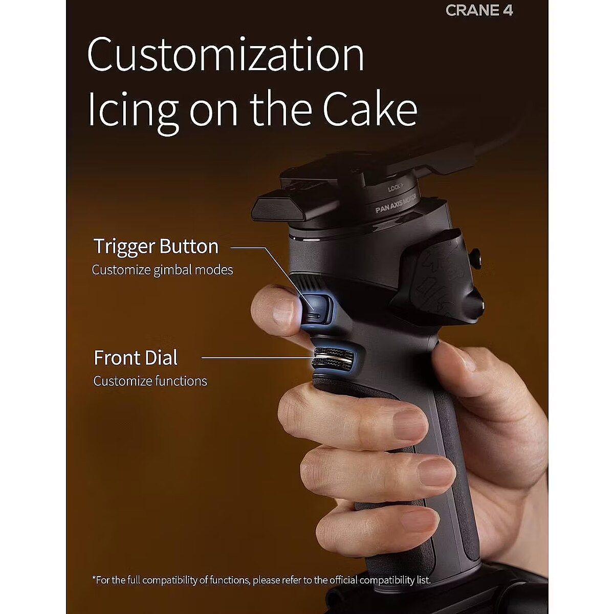 description_en - Stabilizer for large full-frame hybrid cameras and compact cinema cameras Built-in 10 W LED fill light 1.22" color touch screen Balance LED indicator on each motor Up to 12 hours of working time, fully charged again in less than 2 hours Wireless Bluetooth connection Weighs 1673 g The Zhiyun Crane 4 gimbal allows filmmakers and content creators to focus on the creative process without being constrained by the weight and capabilities of the camera kit. With a longer handle, stronger motors, an extended quick release plate and a built-in light, the Zhiyun Crane 4 is the optimal solution for filming with larger full-frame sensor hybrid cameras and compact cinema cameras. Thanks to its exceptional stabilization capacity and light and ergonomic design, the Crane 4 stabilizer ensures a more comfortable working position and more precisely controlled movement. Advanced design