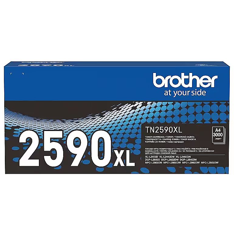 Ten oryginalny czarny toner o wysokiej wydajności TN2590XL został zaprojektowany z myślą o konsekwentnym tworzeniu wyraźnych wydruków.