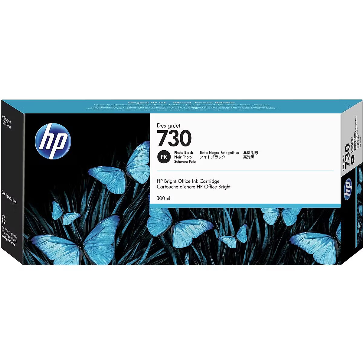 LongSummaryDescription - HP 730 300-ml Photo Black DesignJet Ink Cartridge. Compatibility: HP DesignJet T1700 Printer series, Print technology: Thermal inkjet, Printing colours: Black. Width: 283 mm, Depth: 41 mm, Height: 118 mm. Package width: 283 mm, Package depth: 41 mm, Package height: 118 mm. Master (outer) cases per pallet: 102 pc(s), Products per pallet: 510 pc(s), Layers per pallet: 6 pc(s). Pallet dimensions (W x D x H) (imperial): 1016 x 1219.2 x 919.5 mm (40 x 48 x 36.2"), Pallet weight (imperial): 304.4 kg (671 lbs)