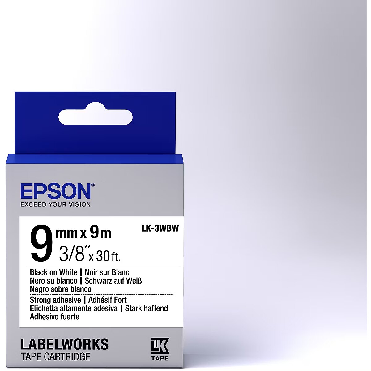 LongSummaryDescription - Epson Label Cartridge Strong Adhesive LK-3WBW Black/White 9mm (9m). Label colour: Black on white, Country of origin: Japan, Compatibility: Epson LabelWorks. Tape width: 9 mm, Tape length: 9 m, Quantity per pack: 1 pc(s). Pallet gross width: 80 cm, Pallet gross length: 120 cm, Pallet gross height: 148 cm