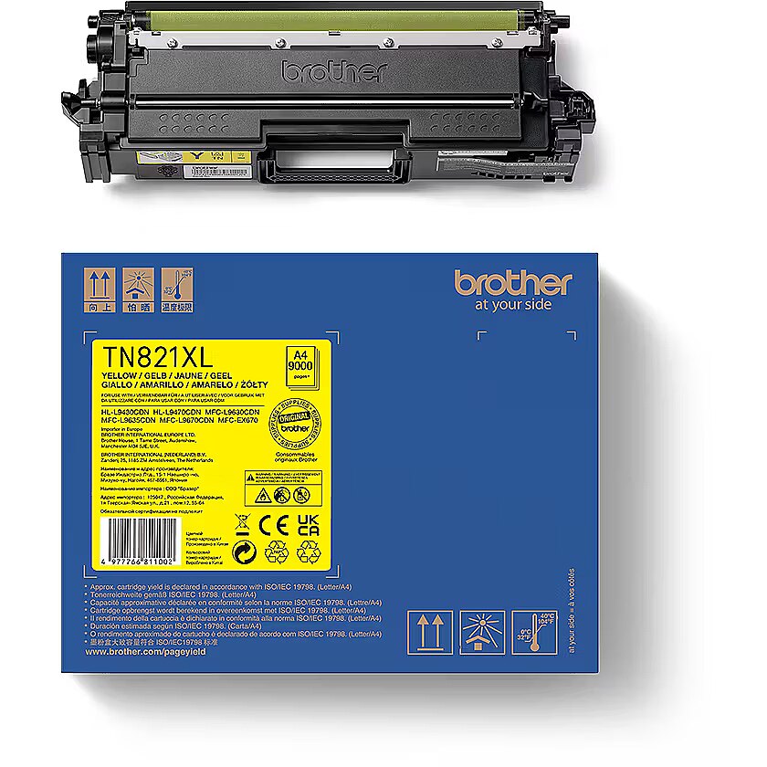 LongDesc - The Brother TN821XLY Yellow Toner Cartridge. Prints 9,000 pages.- Prints up to 9,000 pages in accordance with ISO/IEC 19798- High quality genuine Brother Magenta high yield toner cartridge TN821XLM- Genuine Brother toner cartridges are rigorously tested to print perfectly every time saving you time and money- Using this Brother TN821XLY high yield original laser toner cartridge protects your printer warranty- The TN821XLY Yellow toner cartridge is available as a more economical super high yield toner - TN821XXLYThis genuine replacement TN821XLM magenta high yield toner cartridge, is design to produce crisp clear print outs, time and time again. Compatible with a range of printers, our easy to install cartridges will help you produce long-lasting documents that won’t smudge or fade over time. Brother consider the environmental impact at every stage of your toner cartridge life cycle, reducing waste at landfill. All our hardware and toner cartridges are built to have as little impact on the environment as possible. Genuine Brother TN821XLM Laser toner cartridge - worth it every time. Higher print volume toner cartridges also availableSuper high yield cartridges contain more toner for a higher page yield and lower cost per page.TN821XXL - Black prints up to 15,000 pages, Cyan/Magenta/Yellow each print up to 12,000 pages each in accordance with ISO/IEC 19798Reliability and Quality AssuranceBrother genuine toner is specially formulated to maximise print quality, performance and reliability. Each Brother laser printer is designed to work at pre-set temperatures that are matched exactly to each individual toner formulation to ensure seamless print quality and reliability.Guaranteed to WorkBrother toner cartridges are designed as an entire printing system with Brother printing devices in mind - to provide a superior degree of quality. Genuine Brother toner supplies are the best way to protect your investment and ensure optimal performance from your Brother laser printer, guaranteeing you effortless performance and saving you money in the long run.Performance TestedEach toner cartridge is rigorously print tested to ISO standards in order that every user can be assured of the quality and performance they expect. Get a truly professional finish with Brother genuine laser supplies.Support ‘at your side’Using Brother genuine supplies protects your printer warranty. Brother are always "at your side". We commit to providing excellent sales support and customer care - both before and after purchase.Environmental and RecyclingOur world class toner remanufacturing programme helps to reduce waste extending our product lifecycle and reducing environmental impacts.laser genuineCheck the authenticity of your suppliesYou will find the holographic security label on Brother genuine toner cartridges. Ensure the package and security label has not been tampered with and confirm the hologram security label is genuine by verifying the unique 7-digit ID No. at: www.brother.com/id
