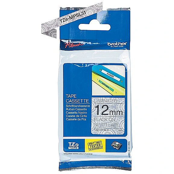 LongDesc - - Black text on silver lace patterned laminated tape- 12mm wide- 4 metres long- Standard adhesiveAdd a stylish personalised message on your gifts and craft projects with this silver lace P-touch tape! Ideal for gifts and presents to family and friends, these labels also look great on notebooks and school books.Use the various features of your P-touch labelling machine to add a touch of elegance to your labels.TZe tape cassettes are quick and easy to install, and come in various label widths, colours and materials - ensuring your P-touch machine can be used for all labelling needs.Brother P-touch laminated labels have been developed to last, even under extreme conditions, and are able to withstand extremes of temperature, sunlight, water, chemicals and abrasion.