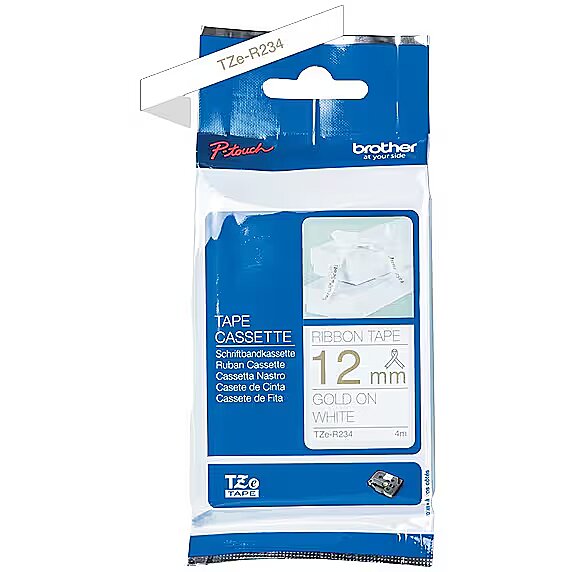 LongDesc - Work your magic by adding a personalised touch to gifts, cards and crafts, with the genuine Brother TZe-R234 ribbon tape. With the TZe-R234 you can rely on a fast and reliable output, as well as a sharp and professional standard of printing. Compatible with P-touch label printers that show the TZ or TZe logo on the tape cassette cover.With the TZe-R234 you can enjoy fast and reliable output, as well as a sharp and professional standard of printing. The beautiful Gold on white Brother TZe-R234 labelling tape is guaranteed to provide you with quality labels. With a luxury shiny finish this non-adhesive fabric ribbon is perfect for present wrapping and crafting.
