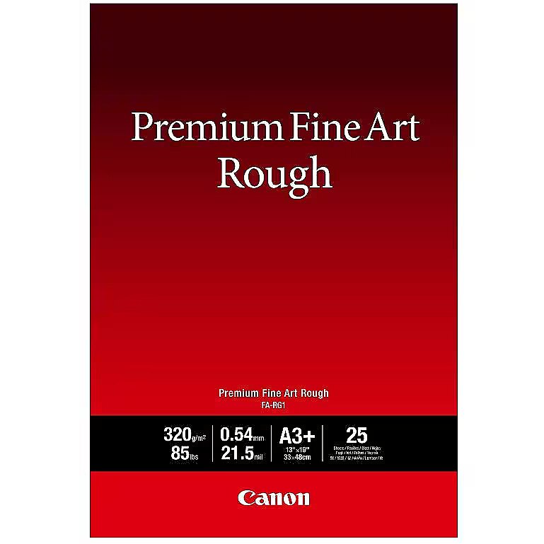 LongDesc - Canon Premium Fine Art Rough Paper A3+ paper is high quality cotton paper developed to produce the best image quality with pigment ink. Its rough texture is ideal for expressing depth in an image and adding three-dimensional touch. Professional, experienced enthusiast photographers and art lovers will enjoy printing photos and other fine artwork on this paper. Suitable for long-term storage, this paper has a satisfying roughness, thickness and luxury touch, meaning your artwork will truly shine. Combined with genuine Canon LUCIA PRO ink in which the ink formulation has been optimised, resulting prints are rich in colour and black density and thanks to the paper’s 100 percent cotton base, image longevity and high durability are assured.