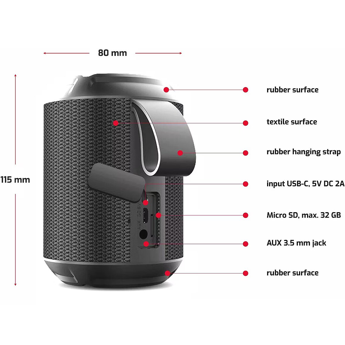 The speaker has plenty of music playback options. Both wirelessly via Bluetooth, as well as via the AUX-IN 3.5mm JACK cable, from a micro SD memory card, but also via a USB-C cable connected to a computer.
