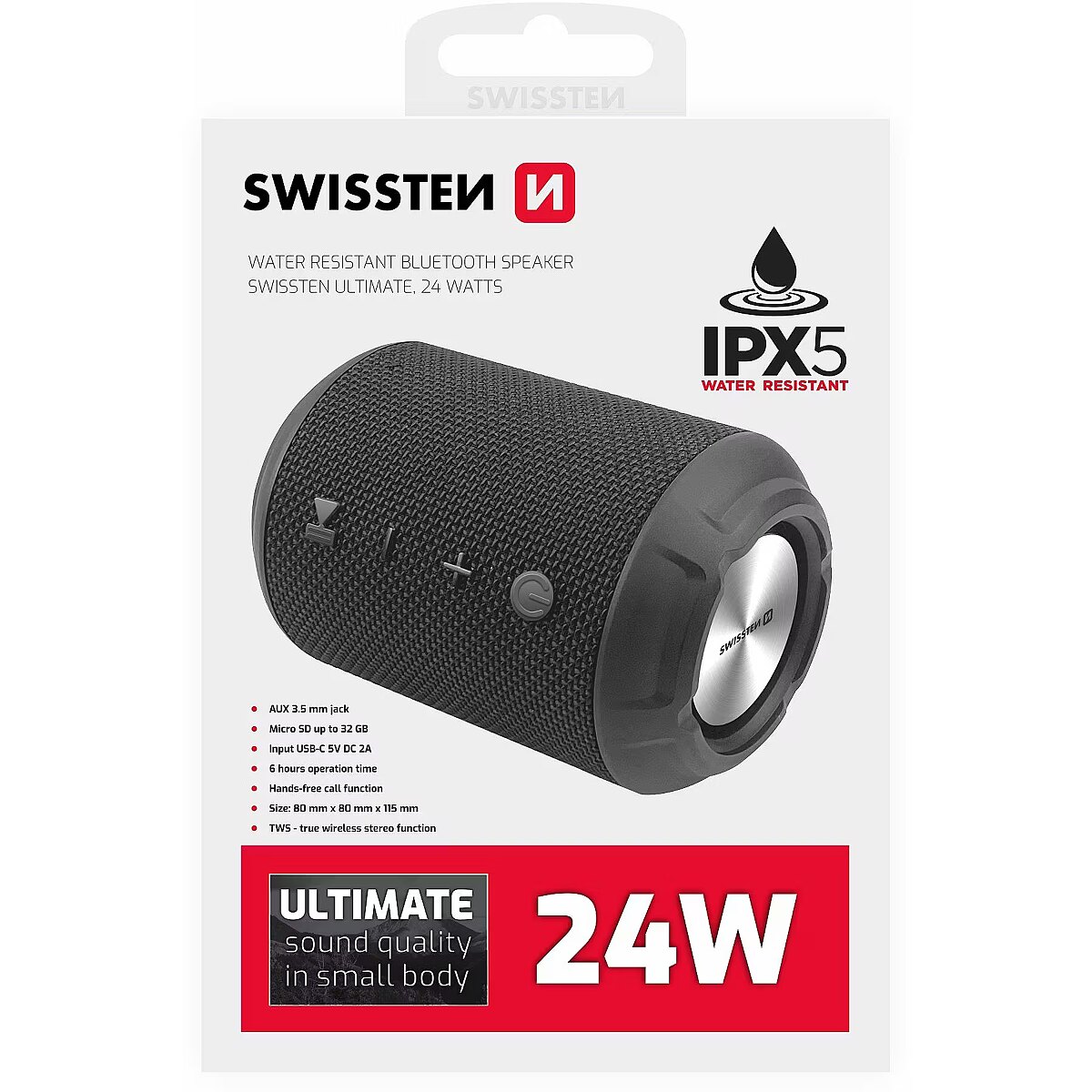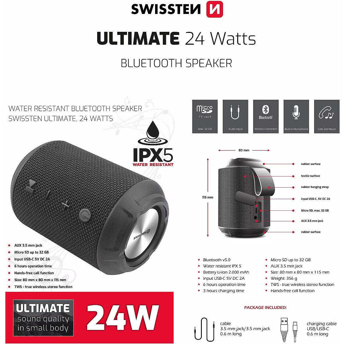 description_en - The SWISSTEN ULTIMATE Bluetooth speaker features perfect sound, attractive design and 24W power. IPX5 waterproof, AUX-IN, micro SD inputs and TWS function. Packed in a SWISSTEN retail pack.