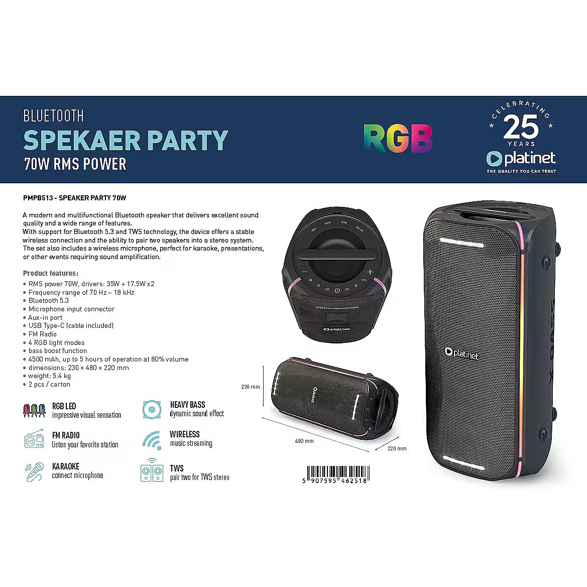 description_en - Platinet Boombox wireless speaker with microphone offers powerful and high-quality sound for any situation. Thanks to Bluetooth 5.3 connection and TWS technology, you can connect two speakers into one stereo sound system. The included wireless microphone makes it an ideal choice for karaoke, events and performances. The compact design and durable housing make the speaker easy to carry. The built-in 4500 mAh battery allows for up to 5 hours of music enjoyment (at 80% volume). The bass boost function ensures deep and dynamic sound for parties, conferences and home entertainment. Reliable Bluetooth 5.3 connection with a range of up to 10 m TWS function - the ability to connect two speakers for stereo sound Wireless microphone included - suitable for karaoke and performances Output power: 70 W RMS (35 W + 17.5 W × 2) Bass boost function for deeper bass Supports Bluetooth / USB / AUX / TF / microSD / FM radio Plays formats: MP3, WAV, WMA, FLAC, APE Built-in 4500 mAh battery, operating time up to 5 hours Charging time: about 5 hours 4 RGB lighting modes Durable ABS housing Dimensions: 244 × 232 × 480 mm Weight: 5.4 kg