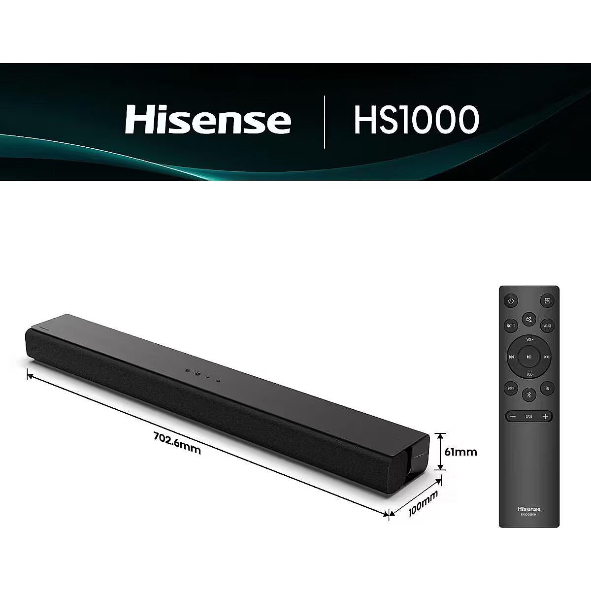 LongSummaryDescription - Hisense HS1000. Audio output channels: 2.0 channels, RMS rated power: 120 W, Audio decoders: DTS Virtual:X, Dolby Audio, Dolby Digital Plus. Product colour: Black. Connectivity technology: Wired. AC input voltage: 100-240 V, AC input frequency: 50-60 Hz, Soundbar power consumption: 120 W. Width: 702 mm, Depth: 100 mm, Height: 57 mm