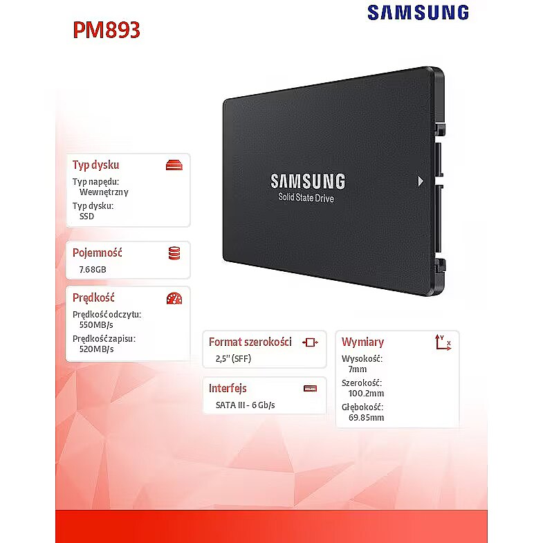 LongSummaryDescription - Samsung PM893. SSD capacity: 7.68 TB, SSD form factor: 2.5", Read speed: 550 MB/s, Write speed: 520 MB/s, Data transfer rate: 6 Gbit/s, Component for: Server/workstation
