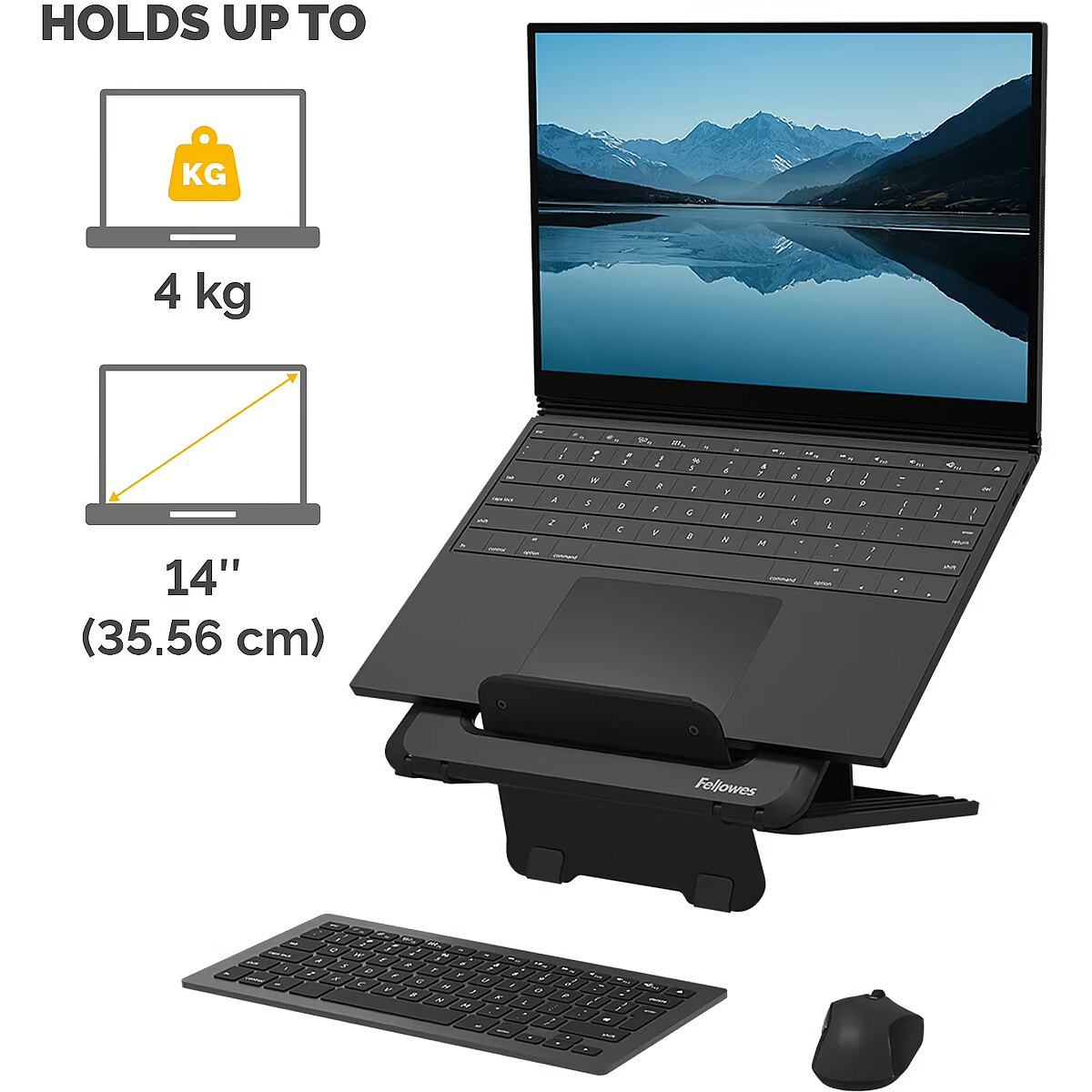 ShortSummaryDescription - Fellowes Laptop Stand for Desk - Breyta Adjustable Laptop Riser for Home and Office - Portable Laptop Stand with 12 Height Adjustments - Max Laptop Size 14", Max Weight 4KG - Black, Laptop stand, Black, Acrylonitrile butadiene styrene (ABS), 35.6 cm (14"), 4 kg, 18.9 cm