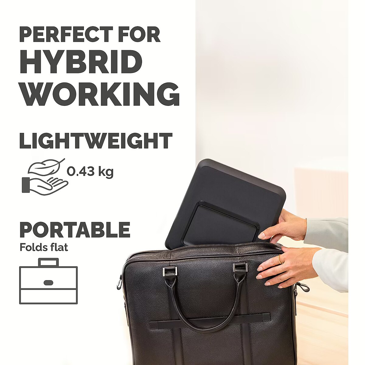 Description - Breyta Laptop Stand - Black 12 height adjustments with unique front lift to provide additional height for ergonomic viewing comfort. Compact, lightweight and portable design that is easy to set up and adjust – ideal for hybrid working. Holds up to 14” laptops weighing up to 4kg. Modern and simple design aesthetics available in black and white colour options. Made from materials which are 100% recyclable and made to last with extended 5-year limited warranty. Tested by FIRA International Ltd to comply with the ergonomic requirements set out in European Health and Safety Legislation: EN ISO 9241-5.