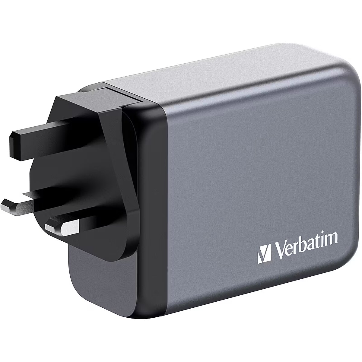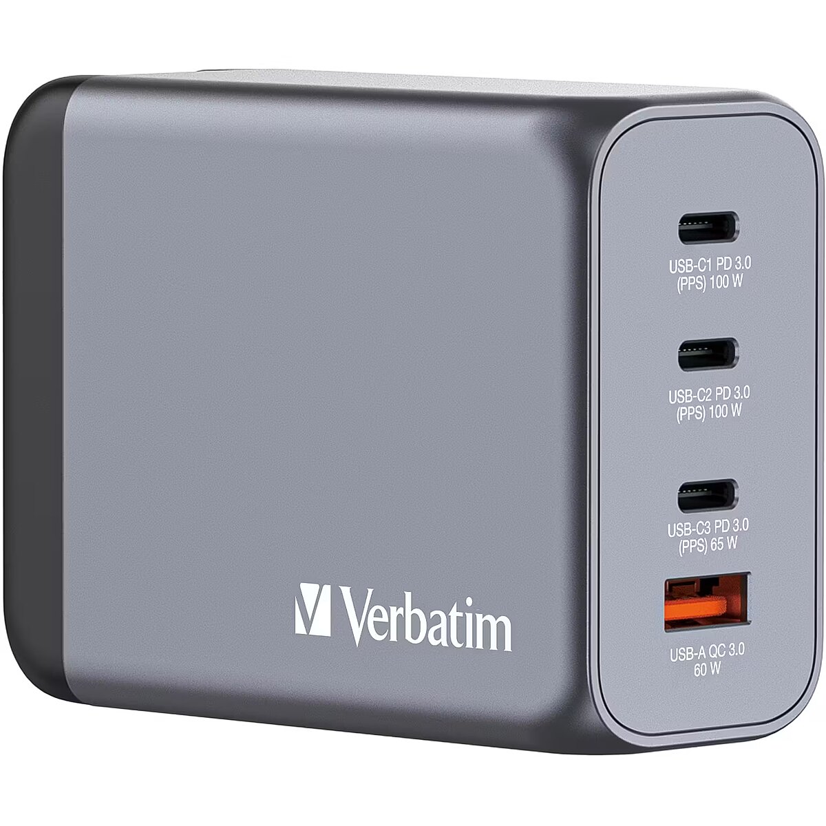 LongDesc - 200W 4-in-1 ChargingVerbatim’s 200W GaN Wall Charger combines two USB-C PD 100W ports, one USB-C PD 65W port and one USB-A QC 3.0 port in a sleek, palm sized design. Ideal for the office, home or travelling to power your laptop, tablet, smartphone, gaming devices, and more. With its foldable US prongs and replaceable EU and UK plugs, it’s the ultimate travel companion.Safe and ReliableThe GaN charger is made with high-quality, flame-resistant materials and features four safety protection systems, including over-current protection, over-voltage protection, short circuit protection, and over-temperature protection to ensure your safety while charging.