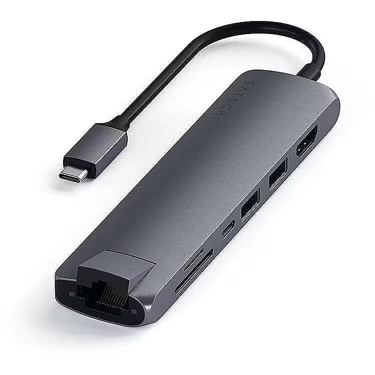 MediumDescription EN - Take your workspace on-the-go with the ultra-portable Satechi USB-C Slim Multi-Port with Ethernet Adapter. Featuring Gigabit Ethernet, 4K HDMI (60Hz), USB-C PD charging, two USB-A 3.0 ports, and micro/SD card readers, the Adapter seamlessly combines seven ports into one compact device. With a plug and play design and modern aluminum finish, it has never been easier to connect your setup on-the-go.