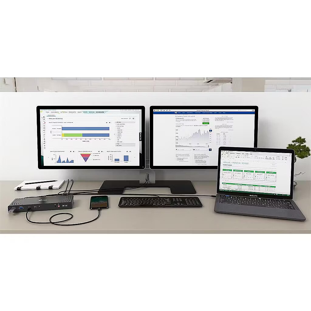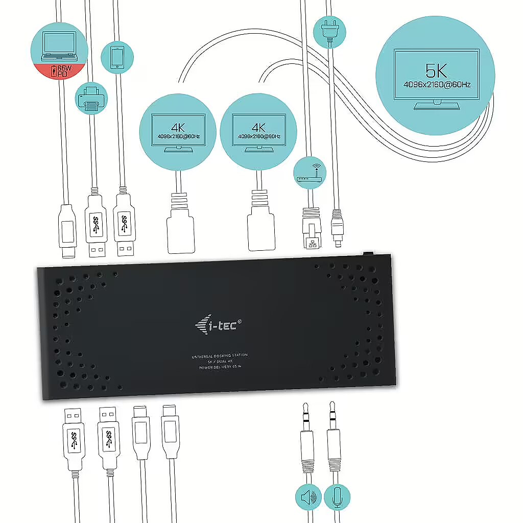 LongDesc - This docking station is designed to be used with any laptop, tablet or smartphone regardless of type, brand or operating system. All you need is for your laptop/tablet/phone to have a free Thunderbolt 3 or any USB port (minimum of USB 3.0 recommended)Do you enjoy detailed graphics with high resolution? If so, then this station can allow you to connect to up to two external monitors or TVs with up to 4K resolution! And of course, you can enjoy truly smooth video thanks to high refresh rate of 60 Hz.Printer? Keyboard? Mouse? External hard drive or flash drive? Charging cable for your phone? You can connect all your devices to the docking station quickly and easily. In addition, you can connect to the Internet thanks a LAN port, eliminating any worries with variable speed and quality of Wi-Fi networks.The new USB-C port has a number of tricks up its sleeve! Provided your laptop or tablet supports power delivery through this port, you gain the ability to connect all you need (data transfer, Internet, video and power supply) using a single cable.Are you using Windows? Do you not make regular backups of your documents, pictures or videos? Install our free i-tec Docker Pro add-on (i-tec.cz/dockerpro) and you can start backing up your data immediately and, more importantly, easily. Connect any hard drive or flash drive to your docking station and the rest is a matter of a few mouse clicks.Enhance your notebook, tablet or smartphone, utilising USB-C or USB-A connectivity. This Thunderbolt 3 compatible USB-C dual monitor docking station features the latest DisplayLink DL9650 chipset and offers the flexibility of both USB-C and USB-A host interfaces. A connecting cable with both ends (USB-C for C, USB-C for A) is a part of the package. As far as the docking station is connected either to a laptop or to a tablet that supports charging-up at its USB-C or Thunderbolt 3 port, then it is able to provide the power supply (Power Delivery) up to 65W.*The unit is equipped with four graphics outputs, 2x HDMI, and 2x DisplayPort, although a maximum of two monitors can be supported simultaneously. Connect two monitors simultaneously and enjoy the higher 4096 x 2160 resolution @ 60 Hz, using any interface configuration (DP + DP, DP + HDMI, HDMI + HDMI). 5K resolution (5120 x 2880 @ 60 Hz) is supported when a single monitor is connected via two DisplayPort cables.4x USB-A 3.0 ports (USB 3.0 / 2.0 compatible) make it easy to connect all of your existing hardware and Gigabit Ethernet RJ45 port provides reliable, robust and high-speed internet connection, supporting 10/100/1000 Mbps speeds. 3.5 mm audio jacks can be found on the front panel and an easily accessible power-saving on/off switch can be found on the rear panel. The addition of a Kensington lock slot provides additional security, especially for those working regularly in public spaces.i-tec docking stations are compatible with the vast majority of notebook brands and platforms, making it easier than ever to connect your favourite hardware. The unit is extremely compact, perfect for use at home or in the office. Due to the hybrid interface option especially hot desk use, due to the USB-C or USB-A interface options.This docking station is suitable for use with MacBook Pro 2016, Macbook 2015, Chromebook Pixel 2015, Acer Switch Alpha 12, Acer Switch Alpha 13, Dell XPS 13, HP Elitebook Folio G1 and ASUS UX390UAK, as well as other devices with USB-C connectivity.* Note: USB-C Power Delivery in selected HP laptops, specifically Elitebook and ZBook, uses proprietary technology. As a result, the resistance in the USB-C circuit is higher than normal. The docking station is fully capable of charging these laptops, although it may need to be reset, using the On/Off button, following initial connection.