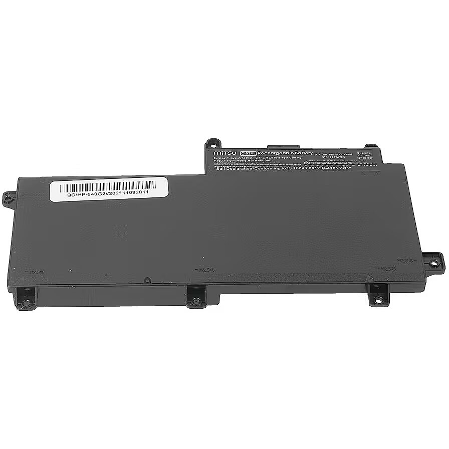 Description - Mitsu Battery for HP ProBook 640 G2 3900 mAh (44 Wh) 11.4 Volt - 5BM722 High quality at a reasonable price, safety and ecology are the features of MITSU batteries that have already been appreciated by thousands of Europeans, mainly in Poland, the Czech Republic and Slovakia. It is the result of combining the best components with attention to every stage of the production process, supported by constant quality control, as well as an emphasis on device safety. MITSU is: High-end, proven, ecological class A lithium-ion cells Actual declared capacity Much slower decline in nominal capacity compared to other cheaper alternatives Low susceptibility to spontaneous discharge No memory effect Factory protections against overcharge and deep discharge, as well as against overvoltage OVP, overheating OTP, SCP short circuit and OCP current overload Reliable and long-lasting time between recharges 6-step quality control. By buying this laptop battery, you can also be sure that you care for the environment at the same time. The manufacturer closely cooperates with organizations dealing with broadly understood environmental education, supporting selective collection and maximum recovery of waste. MITSU batteries are CE, ROHS and ISO9001 certified products. Replaces batteries: 801554-001, C103, C103XL, C1O3, C1O3XL, CI03, CI03048, CI03048XL, CI03048XL-PR, CI03XL, CIO3, CIO3XL, HSTNN-UB6Q, T7B31AA, Model BC/HP-640G2 Fits: HP ProBook series 640 G2, 645 G2, 650 G2, 650 G3, 655 G2,