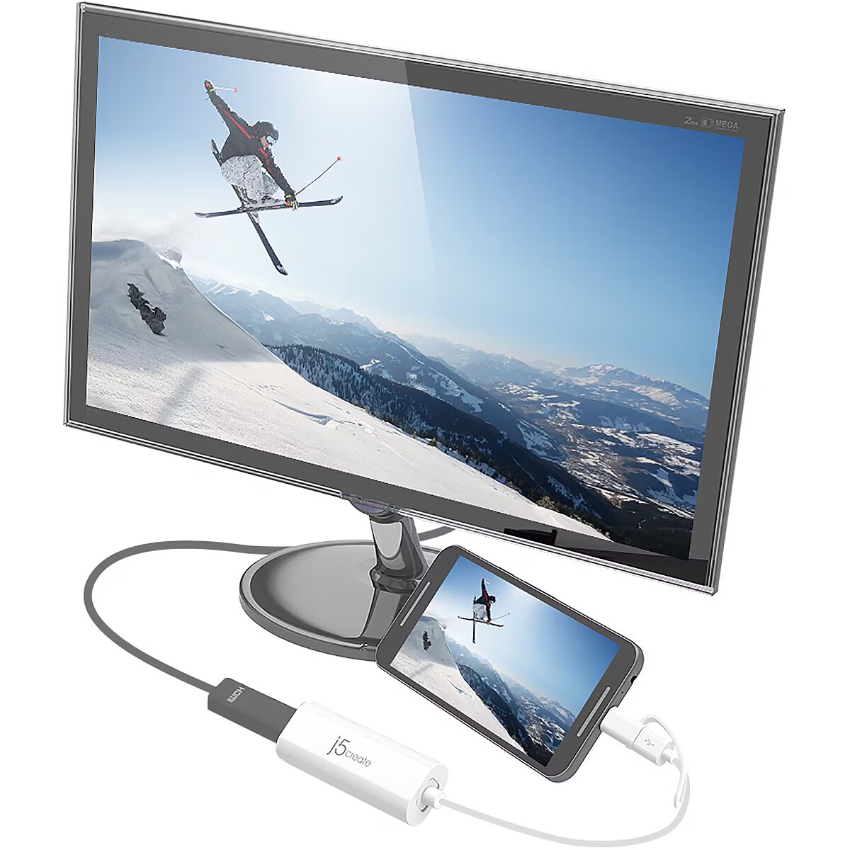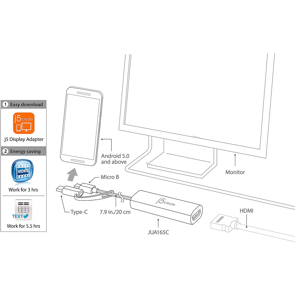 LongDesc - The j5create JUA165C Android USB™ Display Adapter acts as an external video card for your Android Mobile Phone. It allows you to add an additional monitor/display through your USB™ MicroB port or Type-C Port. Simply load the Google® Play app ("j5 Display Adapter" App), plug the adapter into the USB™ Micro-B port or Type-C port, then plug the VGA or HDMI™ monitor cable into the adapter and you are ready. With "Plug & Play" functionality between your Android™ mobile phone and 2nd monitor, you will be able to create a new visual environment in seconds.