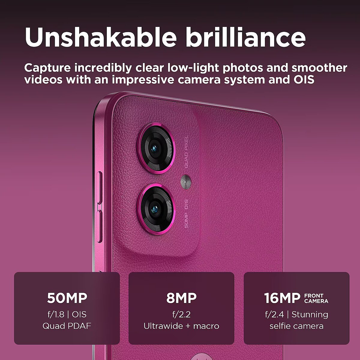 LongDesc - Engineered to entertainIntroducing the phone with entertainment in its DNA. New moto g55 5G. Bring programmes, films and games to life on its immersive 6.49" FHD+ 120 Hz display.(1) Hear sound from every direction with stereo speakers and Dolby Atmos®.(2) Capture incredibly clear photos and smoother videos with a 50 MP camera system featuring optical image stabilisation (OIS).(3) And stand out with an eye-catching design, including options in soft vegan leather. With moto g55 5G, you can binge watch non-stop thanks to a long-lasting battery and speedy charging. Hold more of your favourites with tons of built-in storage. And unleash entertainment at 5G speed with a powerful octa-core processor. moto g55 5G takes entertainment to a whole new level.