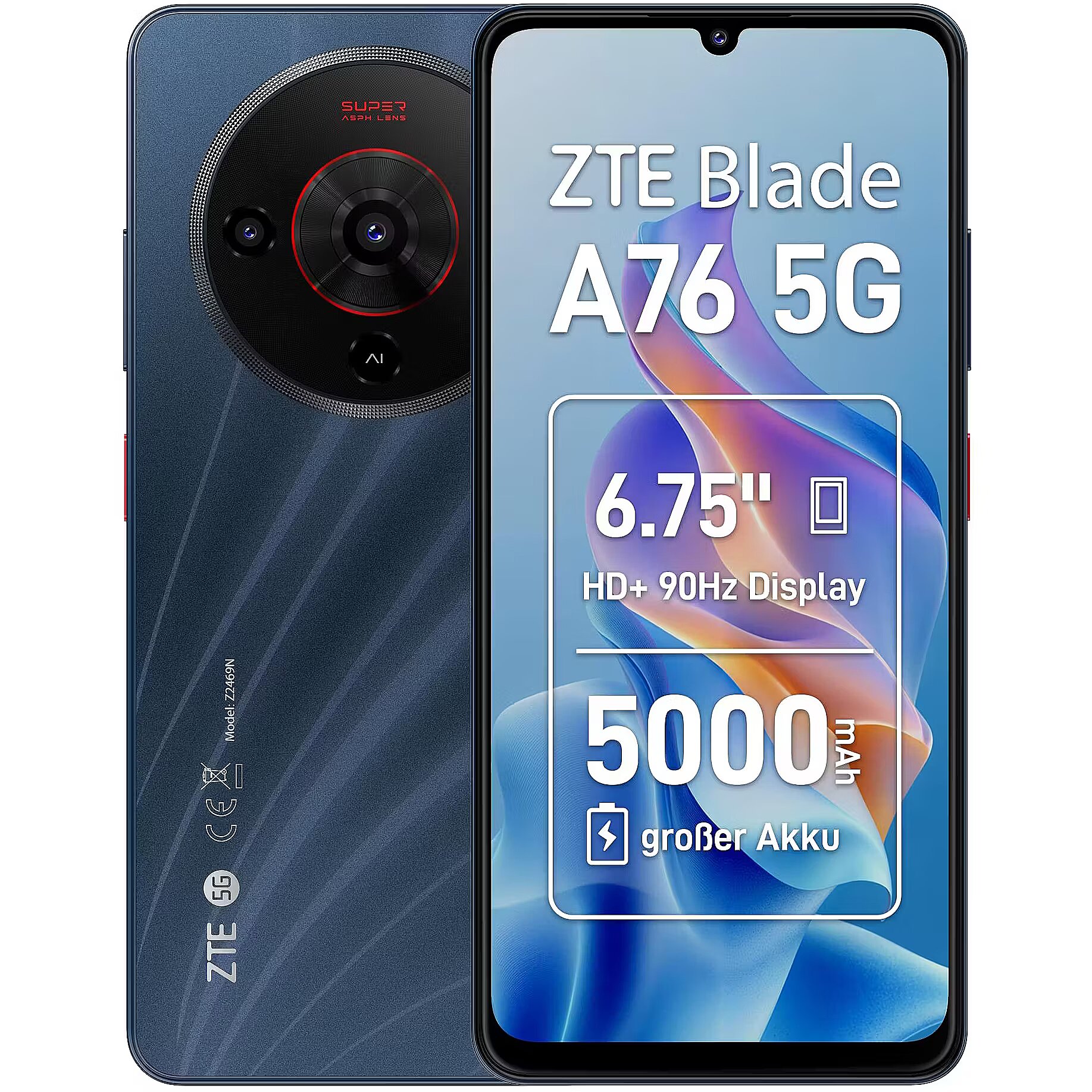 Summary - ZTE Blade A76 5G. Display diagonal: 17.1 cm (6.75"), Display resolution: 1600 x 720 pixels. Processor family: Unisoc, Processor model: T8300. RAM capacity: 4 GB, Internal storage capacity: 128 GB. Rear camera resolution (numeric): 50 MP, Rear camera type: Single camera. SIM card capability: Dual SIM. Battery capacity: 5000 mAh. Product colour: Black. Weight: 203 g