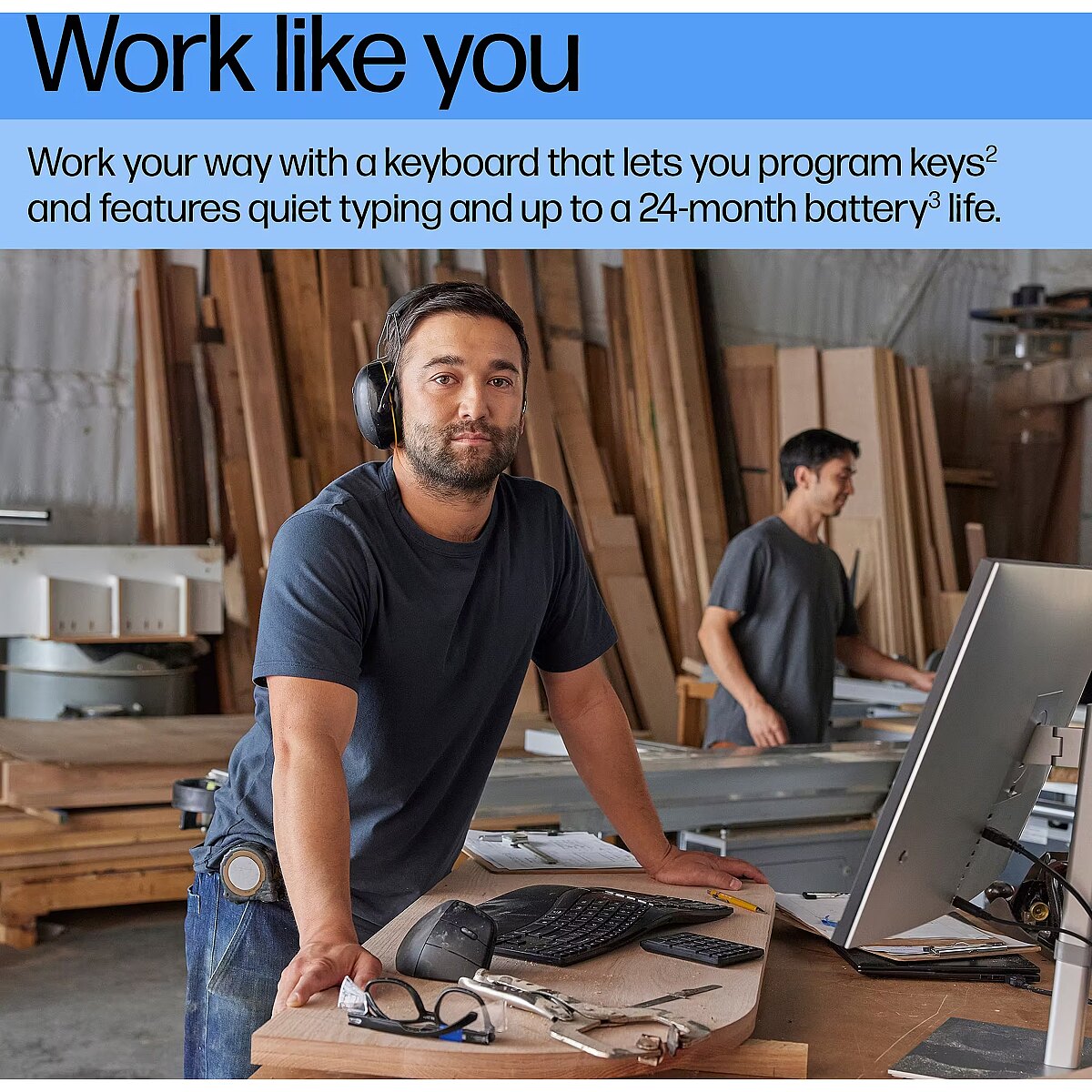 LongDesc - Life. Work. Balanced.Build a space that works for you with the scientifically-designed HP Ergonomic Wireless Keyboard. The split-zone layout adapts to you, while twenty programmable keys[1] and a separate numeric keypad offer total customization. And with two ways to connect devices, you can work assured you've got the right tools for the task.
