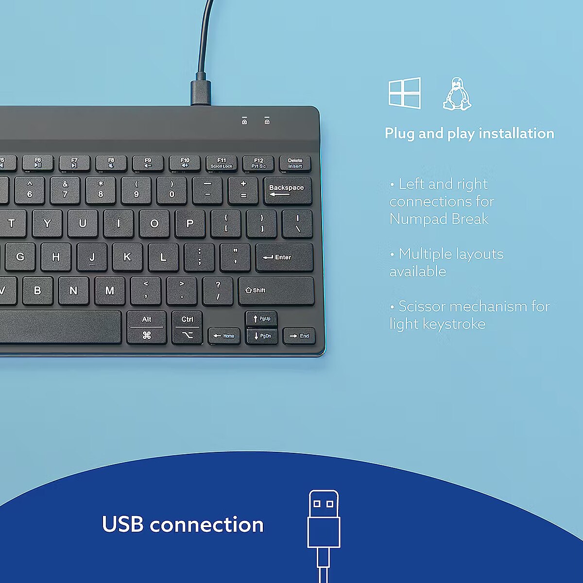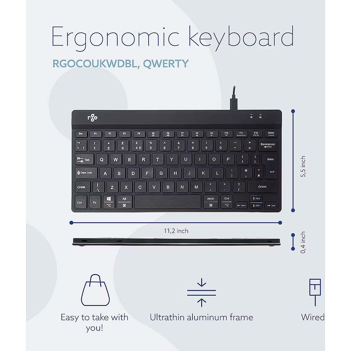 Summary - R-Go Tools Ergonomic keyboard R-Go Compact Break, compact keyboard with break software, QWERTY (US), wired, white. Keyboard form factor: Mini. Keyboard style: Straight. Connectivity technology: Wired, Device interface: USB, Keyboard key switch: Scissor key switch, Keyboard layout: QWERTY. Cable length: 1.6 m. Recommended usage: Office. Product colour: White