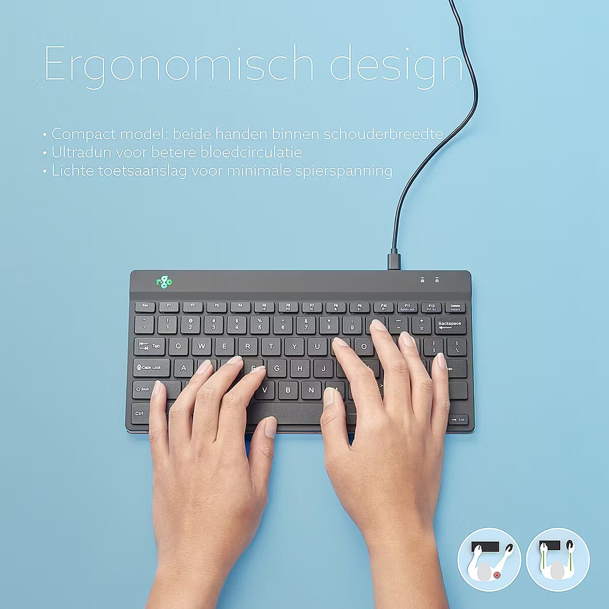 Description - This compact keyboard has all the ergonomic features for healthy typing. The compact design ensures that your hands always remain within shoulder width when using keyboard and mouse simultaneously. The light keystroke reduces muscle tension while typing. The keyboard is ultra thin, so your hands and wrists are in a relaxed, natural position while typing. This ensures better blood flow to your hands.The R-Go Compact Break keyboard indicates with LED colour signals when it is time to take a break. As you type, the light changes colour, like a traffic light. When the light turns green, it means you are working healthily. Orange indicates it is time for a short break and red that you have been working too long. Taking short breaks during your working day will increase your concentration, prevent strain injuries and keep you fit during your working day.This product works together with the R-Go Break Software that won the Benelux Office Products Award 2021.Ergonomisch compact toetsenbord: Het compacte design voorkomt dat je opzij moet reiken naar de muis. Ideaal te combineren met het R-Go Numpad Break. Het toetsenbord is makkelijk mee te nemen, zodat je overal gezond kunt werkenMet pauzesoftware: Voorkom klachten door regelmatig te pauzeren. Dit toetsenbord heeft gepatenteerde pauzesoftware en geeft met kleursignalen aan wanneer het tijd is om te pauzeren. De Break software heeft in 2021 de Benelux Office Award gewonnenDun toetsenbord & Lichte toetsaanslag: Het toetsenbord is erg dun, zodat bloedvaten en pezen niet worden afgekneld. Het speciale schaarmechanisme in de toetsen zorgt voor een lichte toetsaanslag, waardoor minder kracht nodig is tijdens het typenCompatibel & Draagbaar: Sluit dit bedrade toetsenbord eenvoudig aan met de USB-kabel van 1,4m en ga meteen aan de slag. Werkt met PC/desktop/laptop en Windows/Mac. Door het compacte formaat is dit toetsenbord makkelijk mee te nemenGemaakt met oog voor het milieu: De toetsenborden van R-Go Tools zijn gemaakt van gerecycled kunststof en worden geleverd in plasticvrije verpakking