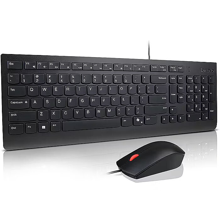 LongDesc - The Lenovo Essential Wired Combo Keyboard & Mouse keeps things simple. This durable keyboard and mouse plugs into any USB port with wired reliability you can count on. The tough waterproof membrane can handle accidental spills without risking performance. Enjoy feel-good typing with quiet keys and number pad in a modern space saving layout. Improve your working efficiency with specialized Microsoft Copilot Key. An ergonomic full size mouse offers comfort and support for all day use. Increase your productivity as you smoothly complete tasks with the 1600DPI high resolution optical sensor.