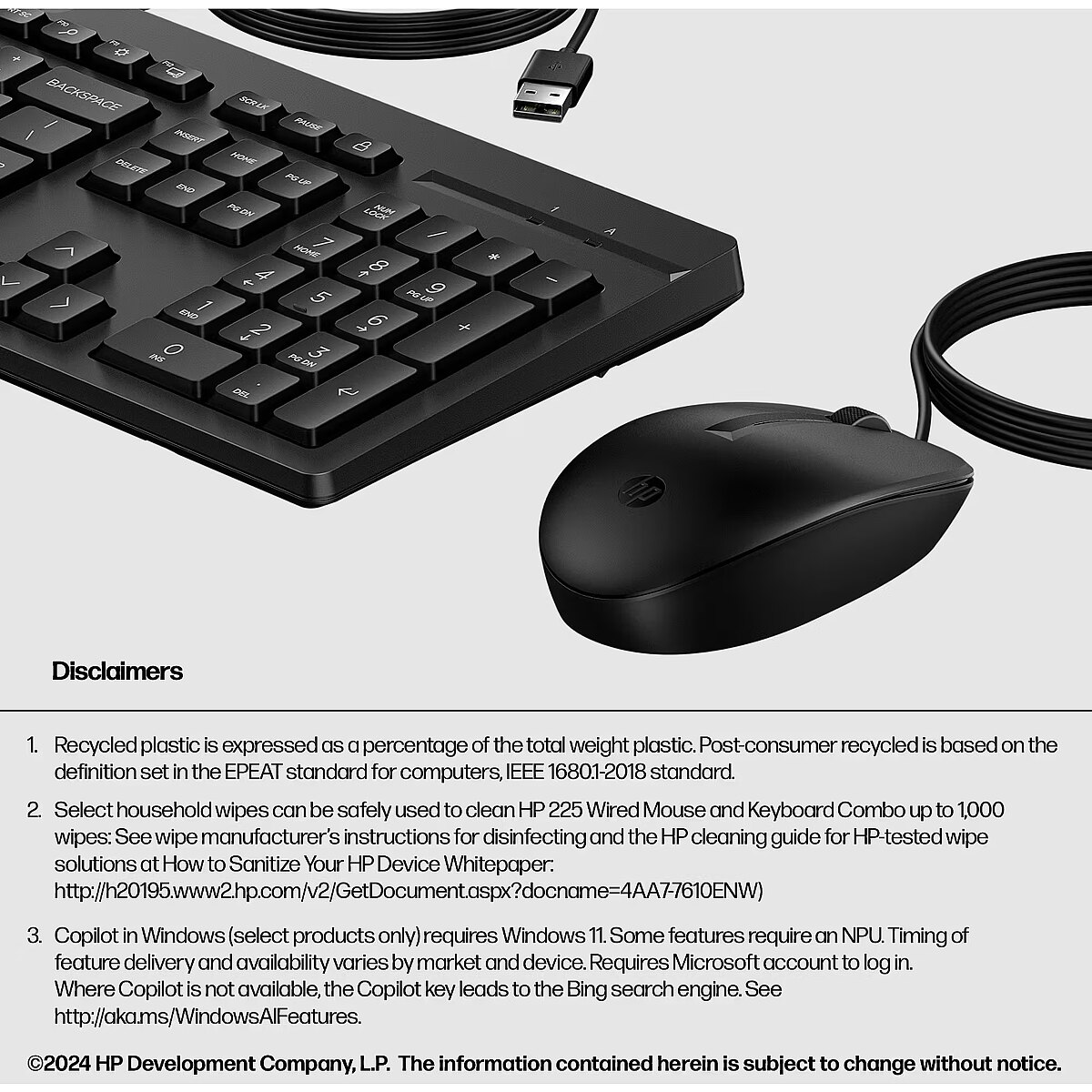ProdDesc - HP 225 G2 USB Wired Mouse Keyboard Combo, Copilot Key, spill resistant - Black - ESTONIAN