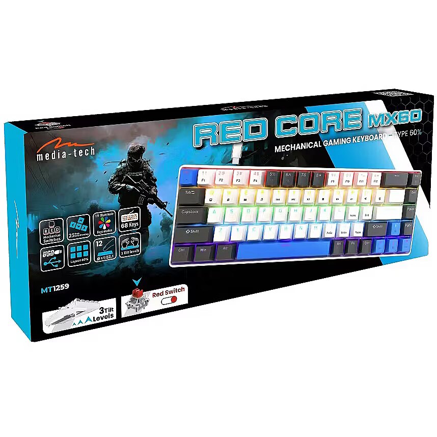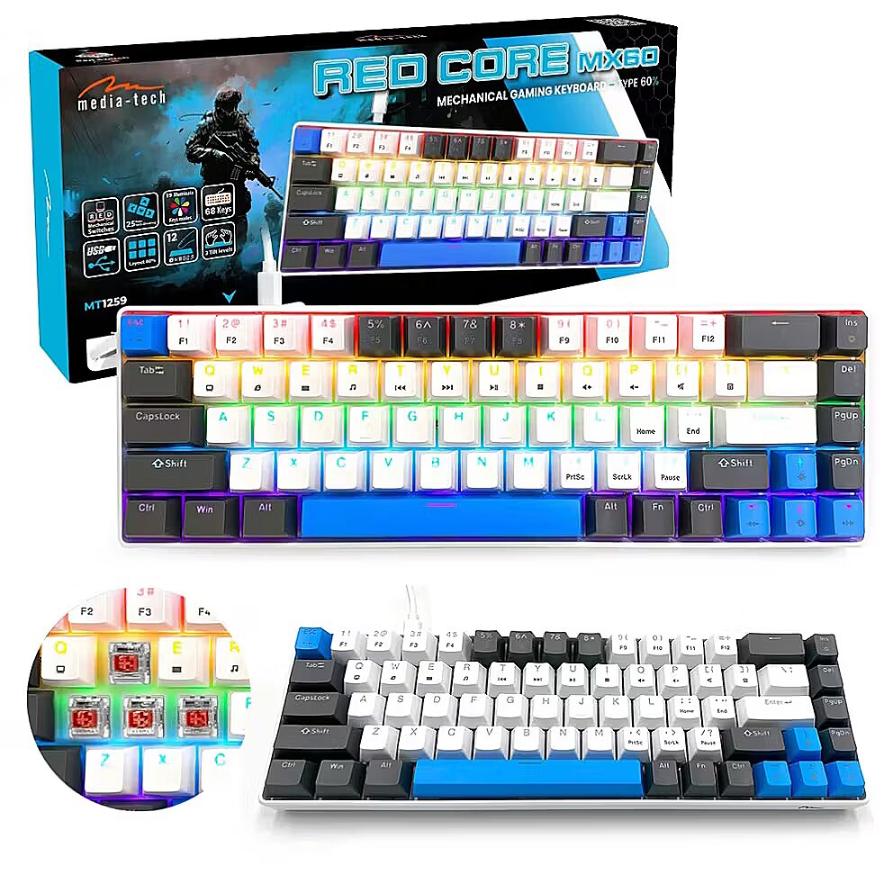 Description - Media-Tech RED CORE MX60 60% Mechanical Gaming Keyboard  60% Mechanical Keyboard RED CORE MX60 MT1259  Discover the precision and speed of the new Media-Tech RED CORE MX60 mechanical keyboard, designed especially for demanding gamers. This compact 60% gaming keyboard combines professional craftsmanship, advanced technology, and stylish designoffering everything you need to gain an edge in gaming. Precise RED Mechanical Switches The RED CORE MX60 is equipped with durable RED mechanical switches, tested for up to 50 million keystrokes. These professional-grade switches deliver lightning-fast response and reliability during intense gaming sessions. Unlike membrane keyboards, every mechanical key works independently, ensuring precise and responsive performance for years of use. Compact 60% Layout More space for gaming The 60% layout is the perfect solution for players who value ergonomics and desk space. With 68 keys in a compact housing, the keyboard takes up minimal space, giving you more room for smooth mouse movements. The Media-Tech 60% keyboard is easy to carry, making it ideal both for home use and esports tournaments. Advanced Gaming Features Anti-ghosting technology for 25 keys eliminates input conflicts during simultaneous key presses. 12 multimedia functions accessible via the FN key allow quick control of music playback and volume adjustment without interrupting your game. The RED CORE MX60 gaming keyboard also offers 3 adjustable tilt angles, letting you customize your setup for maximum comfort. Spectacular Key Backlighting 19 dynamic lighting modes transform every gaming session into a visual spectacle. The multicolor illumination not only looks impressive but also makes gaming easier in low-light conditions. With a wide range of lighting effects, you can fully personalize the keyboard to match your gaming style and setup. Universal Compatibility & Easy Setup The 160 cm USB-C cable provides a stable connection to your computer. The RED CORE MX60 is fully compatible with Windows (8, 10, 11) and Mac OSno additional drivers required. Plug-and-play functionality means you can jump straight into gaming after connecting the keyboard. The Media-Tech RED CORE MX60 mechanical gaming keyboard is a professional tool that combines durability, precision, compact size, and stunning illumination. Perfect for gamers seeking a high-quality 60% keyboard with advanced gaming features. Two Stylish Color Variants The Media-Tech RED CORE MX60 comes in two attractive color editions to match your personal taste and gaming setup. MT1259 A fresh combination of white, gray, and blue, giving the keyboard a modern look that perfectly complements light-colored computer setups. MT1260 A bold black-gray-green design, delivering a strong gaming vibe and looking great in any professional setup. With two color options, every gamer can choose a keyboard that perfectly fits their style and environment.