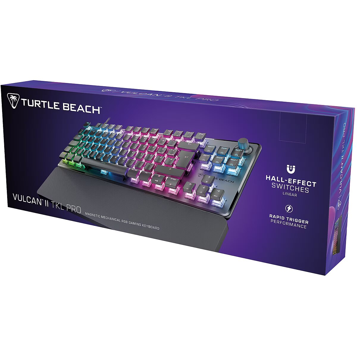 LongDesc - Insanely responsive, and immensely customizable, the Turtle Beach Vulcan II TKL Pro Magnetic Mechanical RGB PC gaming keyboard delivers pro-level performance in a compact TKL form. Equipped with analog hall-effect magnetic switches for silky smooth, reliable key presses rated at a 150M click lifecycle and they have a fully adjustable actuation point from 0.1mm to 4mm. And with Rapid Trigger setting, you’ll have better, more precise movement control, with less downtime between key presses. Lastly, the per-key AIMO™ Intelligent RGB lighting, five on-board profiles and adjustable actuation points can all be customized using the Swarm™ II desktop software. Analog Hall-Effect Magnetic SwitchesUltra-responsive magnetic switches are pre-lubed and rated at a 150M click lifecycle for silky smooth, long-lasting key presses. Hall-effect technology equips you with game-changing features like Rapid Trigger setting, controller emulator, adjustable multi-point actuation, and more.Rapid Trigger PerformanceDominate your opponents in FPS and battle royale games with Rapid Trigger setting. Rapid Trigger eliminates downtime between key presses, so you can immediately repress, resulting in better movement control, responsiveness and faster aiming.Per Key Sensitivity AdjustmentAdjust the actuation point of every key together or individually, with shorter key travel for faster response in shooters, or longer key travel for more deliberate, precise control. Each key has 40 presets heights from 0.1mm to 4mm and you can assign up to three inputs per key. Plus, for added convenience these can be adjusted all together using the keyboard or individually in the Swarm™ II desktop software.AIMO™ Intelligent RGB Lighting With double the refresh rate of a standard gaming keyboard, AIMO™ lighting technology produces smooth and vibrant RGB lighting effects right out of the box and can sync with other compatible AIMO™-enabled products.Advanced Customization with Swarm™ II SoftwareTake your keyboard performance and aesthetics to the next level using the Swarm™ II desktop software. Adjust the AIMO™ RGB lighting, assign up to three different inputs per key, adjust key actuation points, enable Rapid Trigger setting and record & assign macro functions. And for even further customization, you can assign controller emulator features such as left analog stick control for precise, smooth 360-degree movements, in FPS, open world and adventure games, and assign left and right trigger control for gradual acceleration or braking in racing games.5 On-Board ProfilesSave up to five on-board profiles for custom lighting, key re-assignments, macros, basic functions, Hotkeys and more.Easy-Shift [+] ™ Button DuplicatorOur Easy-Shift [+] ™ technology adds a secondary function to compatible keys. Simply hold down the designated modifier key for double the command power in an instant, plus it’s fully customizable in Swarm™ II.Advanced Anti-GhostingAdvanced Anti-Ghosting technology is optimized for gamers to ensure reliable keystrokes every time, even when multiple keys are pressed at once.3rd Party Keycap CompatibleThe Vulcan II TKL Pro is equipped with T-shaped ABS keycaps and is fully compatible with 3rd party keycaps to customize your layout.Tenkeyless Form Factor The tenkeyless form factor lets you play in a more natural, comfortable position while allowing for a larger pad and more area for mouse movement, improving your aiming accuracy.Push-to-Mute Volume WheelControl master volume on the fly, and quickly push to mute using the built-in dial.Sleek, Award-Winning DesignAn iconic design featuring an aluminum plate reinforces its structural integrity and protects against wear and tear. Plus, a double kick stand design with an included, soft palm rest ensures comfort over long usage.