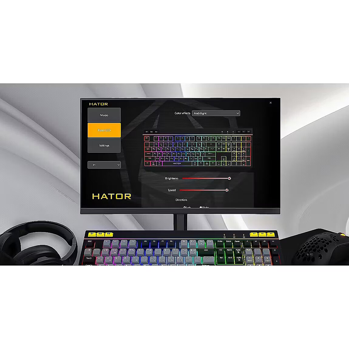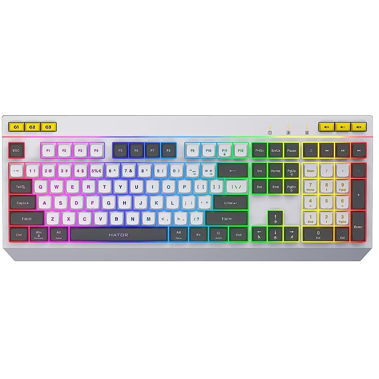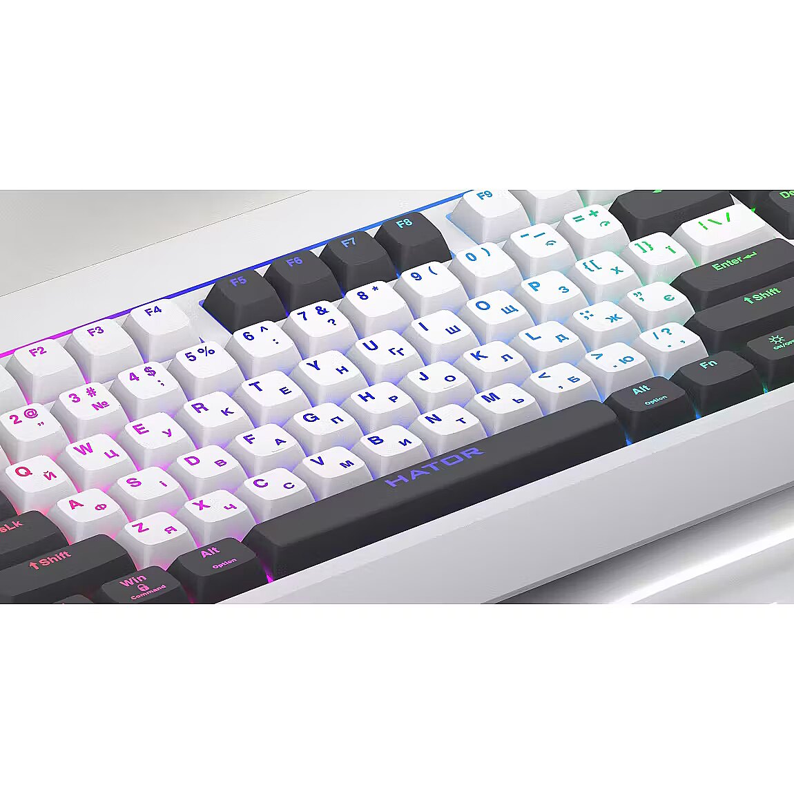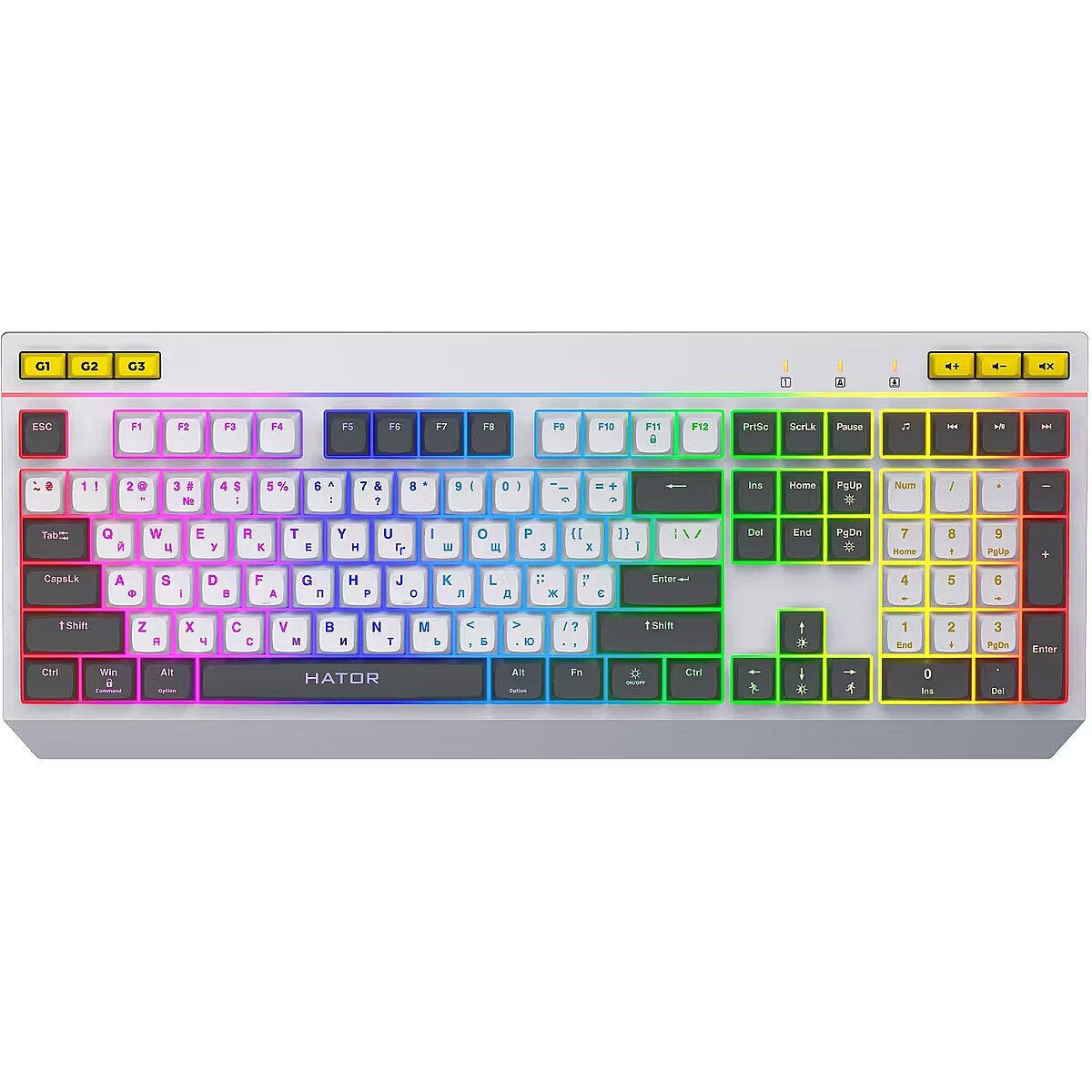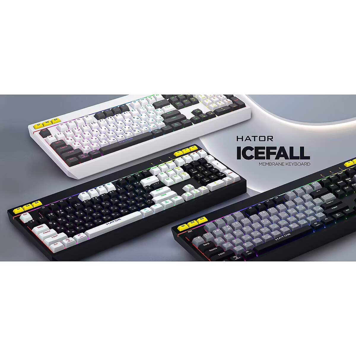 LongDesc - HATOR Icefall full-size membrane keyboard is an ideal choice for those who appreciate convenience and high performance. With quiet operation, a wide range of functions, a thoughtful design and rich RGB lighting, this keyboard is suitable for a variety of usage scenarios.The membrane ensures silent operation of the buttons, which is important in many situations. The softness and quiet pressure of the keys create a comfortable environment for busy work and games.Keycaps with a UV coating and laser engraving will provide greater resistance to erasing symbols and better protection against wear and tear due to frequent use.The keyboard is equipped with keys for controlling multimedia. This allows you to quickly and conveniently control music playback and other functions without distracting from thу work or game.Icefall has separate buttons for quickly switching between memory profiles. Save your settings and macros and activate them in one click, depending on the current tasks. And also use these profiles on any computer without the need to reconfigure them.HATOR Icefall has bright RGB lighting with the ability to adjust for 8 separate zones. Eight preset lighting effects and a custom mode are available for individual customization. This allows you to create a unique atmosphere and emphasize individual style.The keyboard has two height levels, which allows you to choose the optimal position for comfortable work and games. This feature reduces stress on your wrists and ensures long-term use without fatigue.The software allows you to create and save macros, making it easier to create complex commands. This is especially useful for gamers and professionals who require high speed and accuracy.
