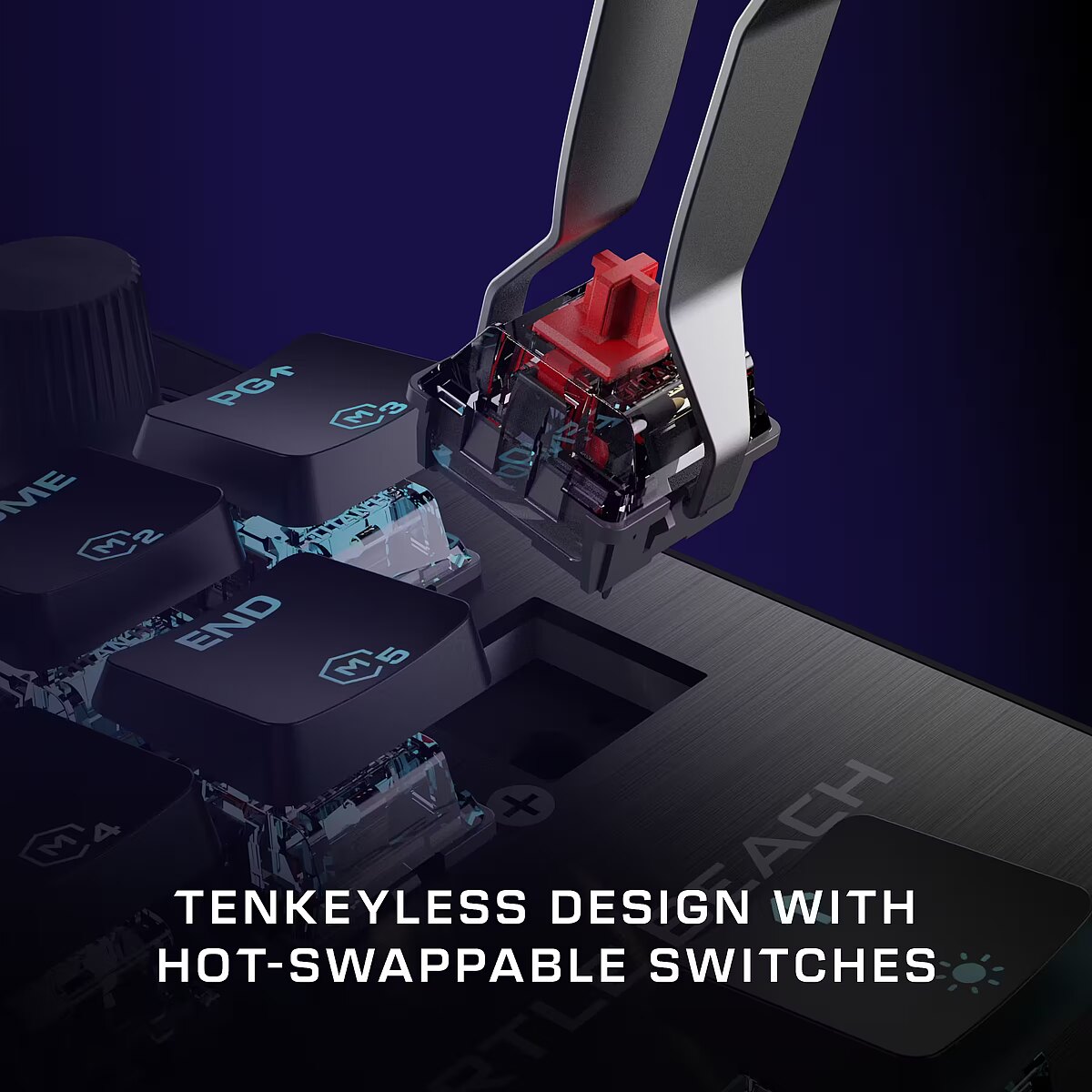 Customize each key with vibrant 16.8M color RGB lighting and sync effects across AIMO™ compatible Turtle Beach gear using Swarm™ II software. Detachable USB-C Cable (Left Side Mounted)