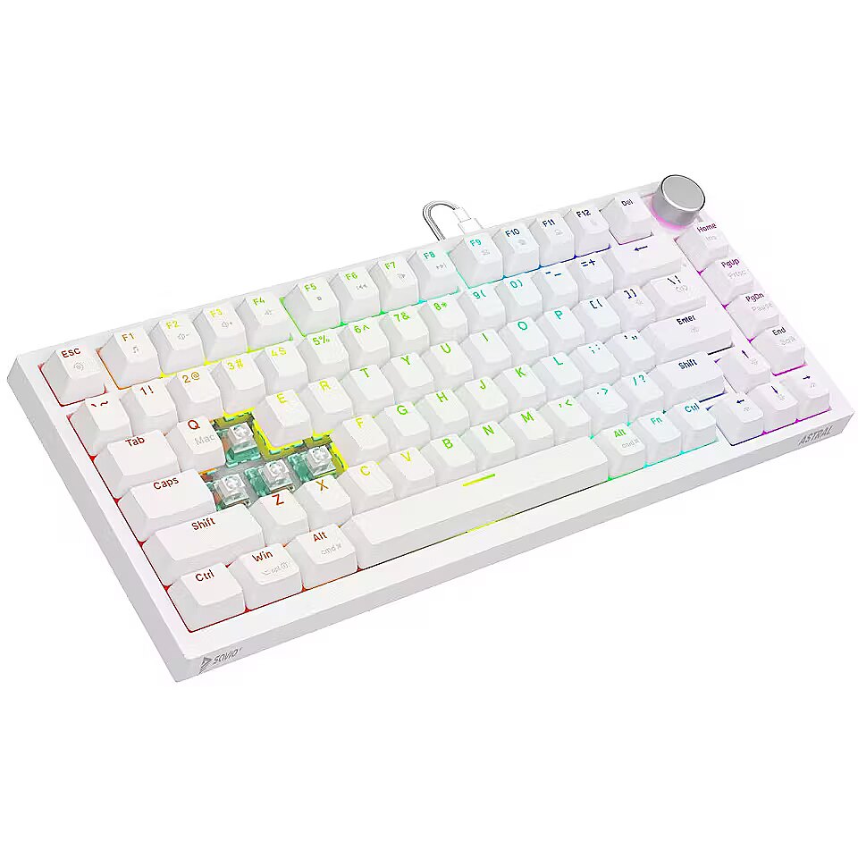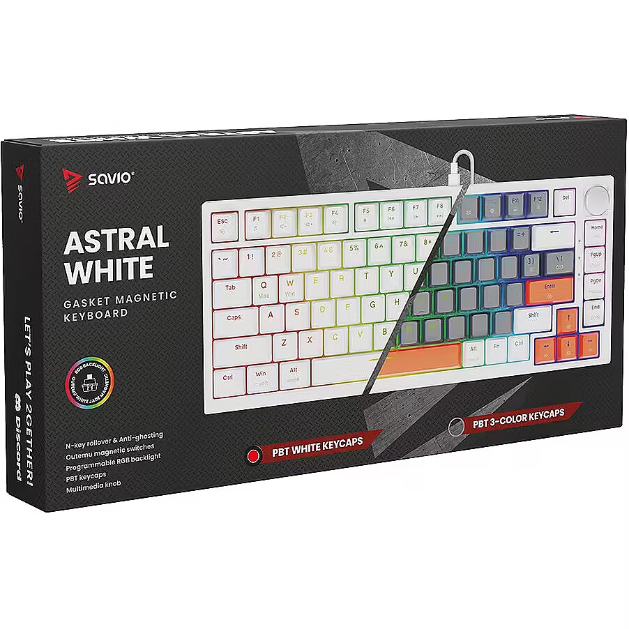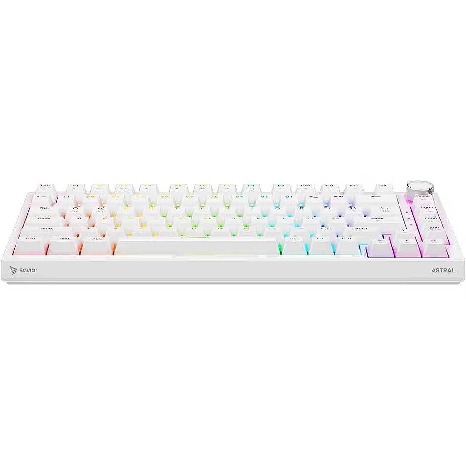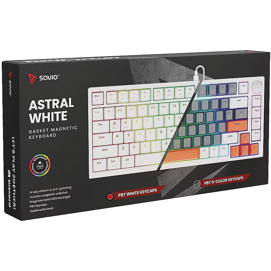 Description - Gasket magnetic keyboard ASTRAL OUTEMU White Jade RGB white Meet ASTRAL the keyboard that changes the rules of the game. This isnt just another classic mechanical keyboard. Its an advanced weapon in your arsenal, built on revolutionary magnetic technology. Encased in a compact 82-key layout, it saves valuable desk space for wider mouse movements without sacrificing functionality. Built with a Gasket Mount structure, the keyboard provides an incredible typing and gaming experience. Thanks to the metal plate with silicone gaskets and layers of damping and sound-absorbing foam, every keystroke feels soft while unwanted echoes and noise are completely eliminated. Full N-key Rollover and Anti-ghosting In the heat of battle, every millisecond and every command matters. ASTRAL White comes equipped with full N-key rollover. What does that mean? You can press all keys at the same time, and the system will flawlessly register each one. This feature is complemented by Anti-ghosting technology. Forget about annoying ghosts those moments when the keyboard registers a key you didnt press or fails during complex combos. Here, you can be sure that your combo executes exactly as intended. Outemu White Jade Magnetic Switches At the heart of ASTRAL are the advanced Outemu White Jade magnetic switches, which use a Hall-effect sensor to detect the position of a magnet instead of a traditional physical contact. As a result, actuation is completely contactless, significantly increasing the keyboards durability and precision. What does this mean for you? Reduced mechanical resistance and faster response compared to traditional mechanical switches Exceptional smoothness: the movement is perfectly linear and fluid Legendary durability: lifespan rated at 100,000,000 clicks  a long-term investment for years of intensive gaming Programmable RGB Backlighting The keyboard features fully programmable RGB lighting, capable of displaying over 16 million colors. With dedicated software, you can create your own macros (command sequences) and customize lighting effects to match your mood or the game youre playing. PBT Keycaps Forget about slippery, shiny keycaps that collect fingerprints. ASTRAL is equipped with PBT keycaps (polybutylene terephthalate) a material much harder and more durable than standard ABS. PBT keycaps offer: A matte, slightly textured surface for a stable grip even during intense gameplay Exceptional wear resistance the legends remain crisp and readable for years Multimedia Control Knob Full control without leaving your game. The built-in, elegant multimedia knob lets you instantly adjust or mute the volume with a single motion. No more shortcuts or minimizing your game just to hear your opponents footsteps or lower the music. Its convenience youll appreciate every day.