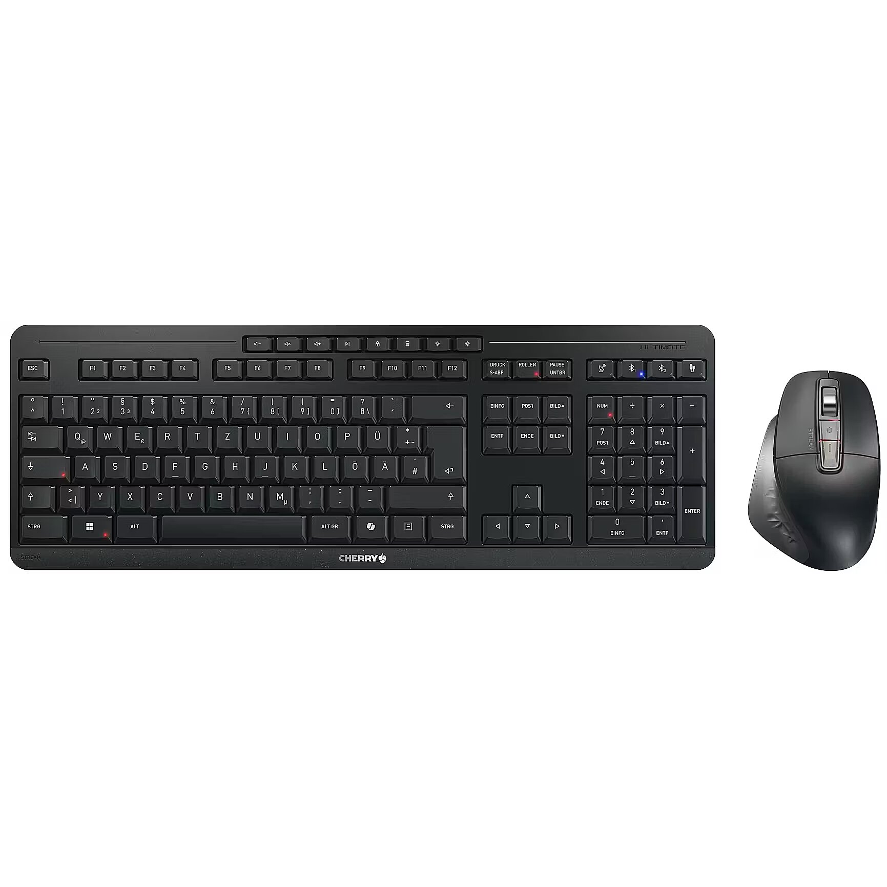 LongSummaryDescription - CHERRY Stream desktop ultimate. Keyboard form factor: Full-size (100%). Keyboard style: Straight. Connectivity technology: Wired & Wireless, Device interface: USB + RF Wireless + Bluetooth, Keyboard key switch: Scissor key switch, Keyboard layout: QWERTZ. Backlight type: LED. Recommended usage: Home/Office. Product colour: Black. Mouse included