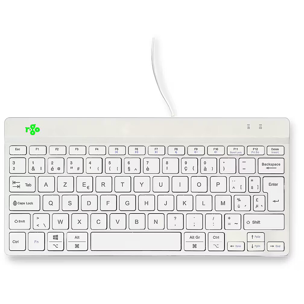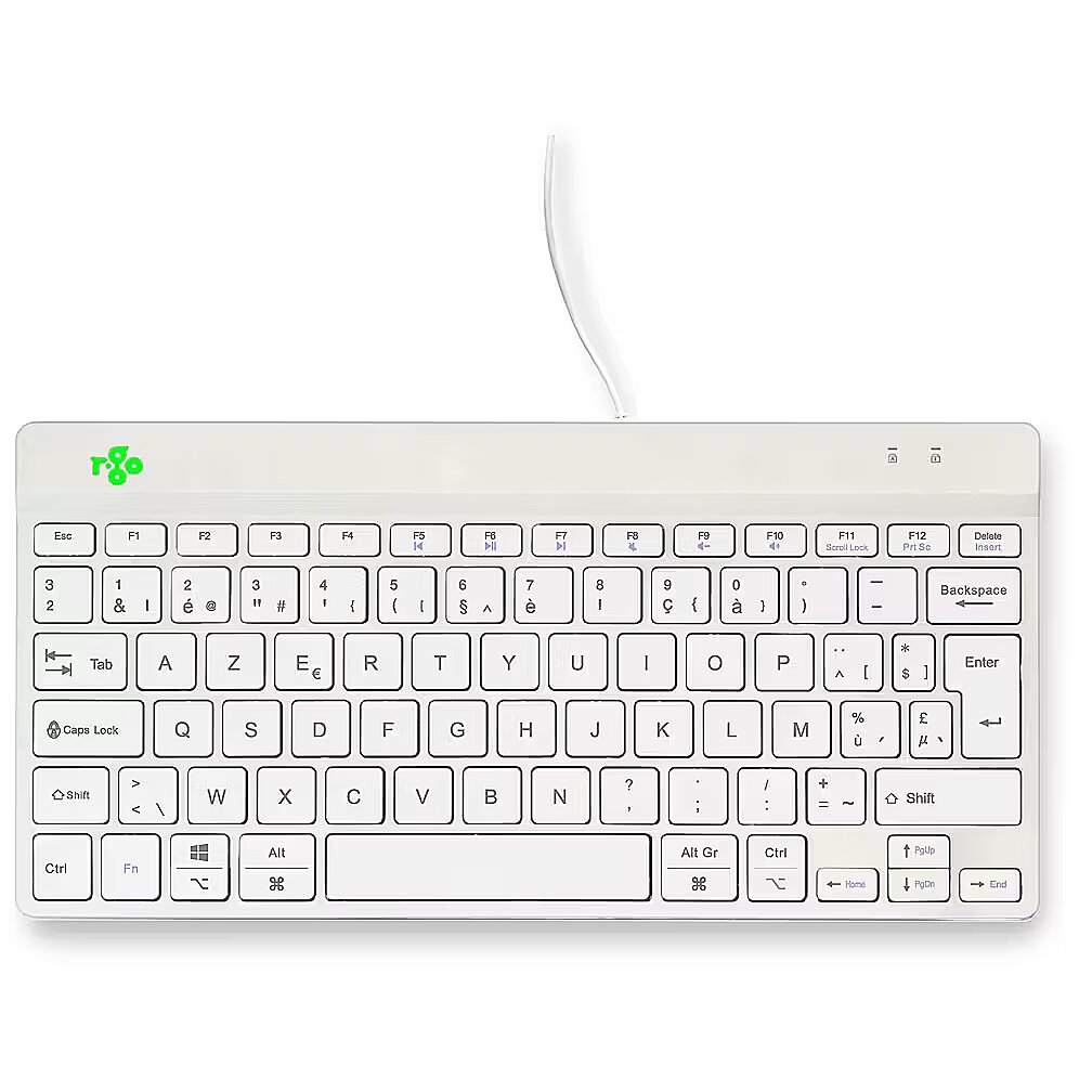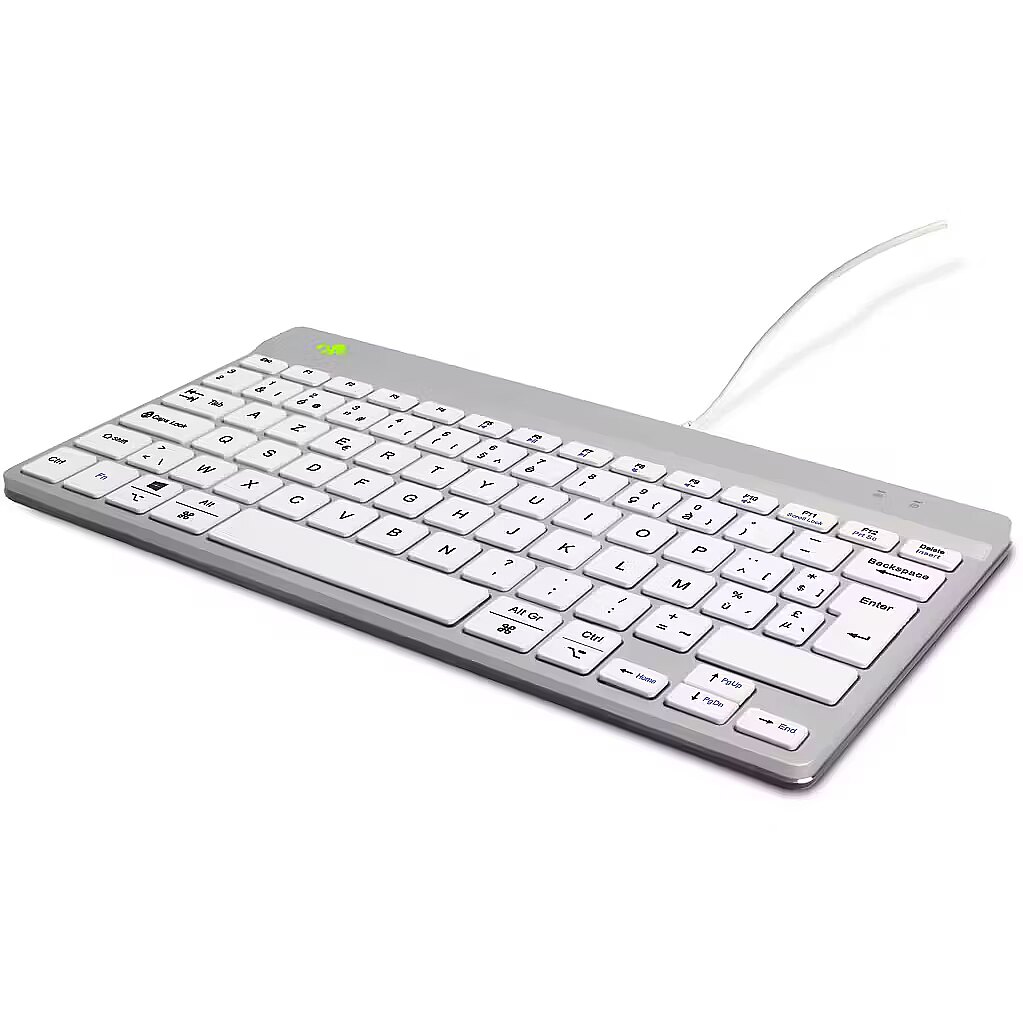 ShortSummaryDescription - R-Go Tools Ergonomic keyboard R-Go Compact Break, compact keyboard with break software, AZERTY (BE), wired, white, Mini, Wired, USB, Scissor key switch, AZERTY, White