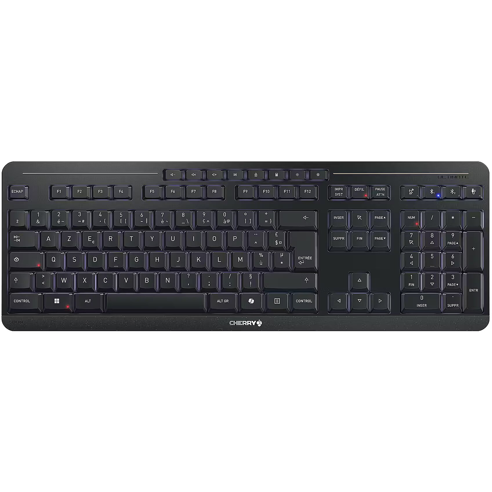 LongSummaryDescription - CHERRY Stream keyboard ultimate. Keyboard form factor: Full-size (100%). Keyboard style: Straight. Connectivity technology: Wired & Wireless, Device interface: USB + RF Wireless + Bluetooth, Keyboard key switch: Scissor key switch, Keyboard layout: AZERTY. Backlight type: LED. Recommended usage: Home/Office. Product colour: Black