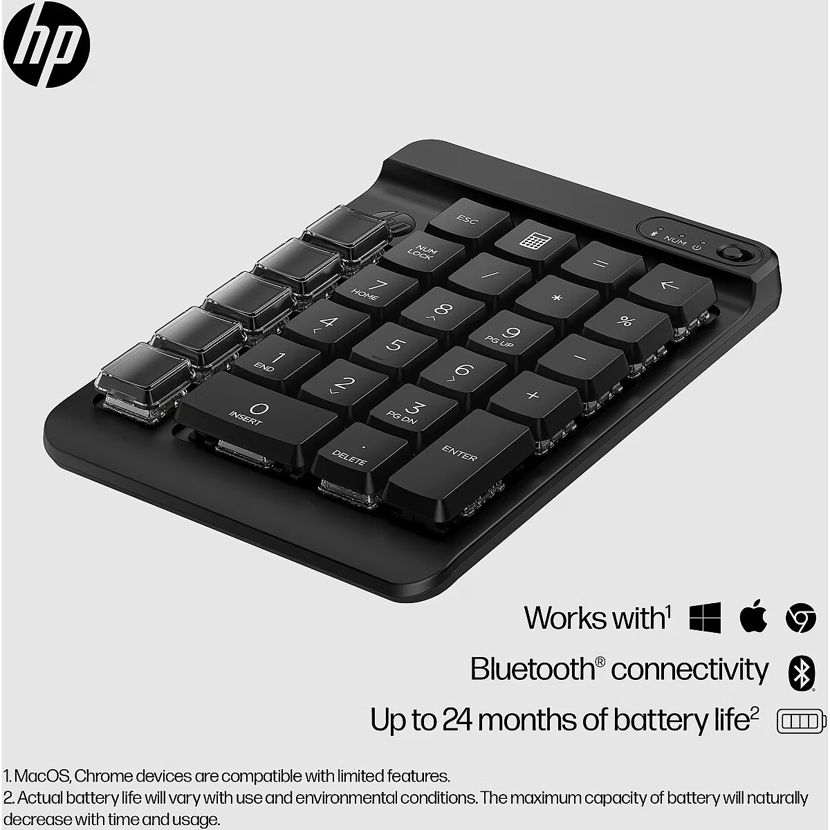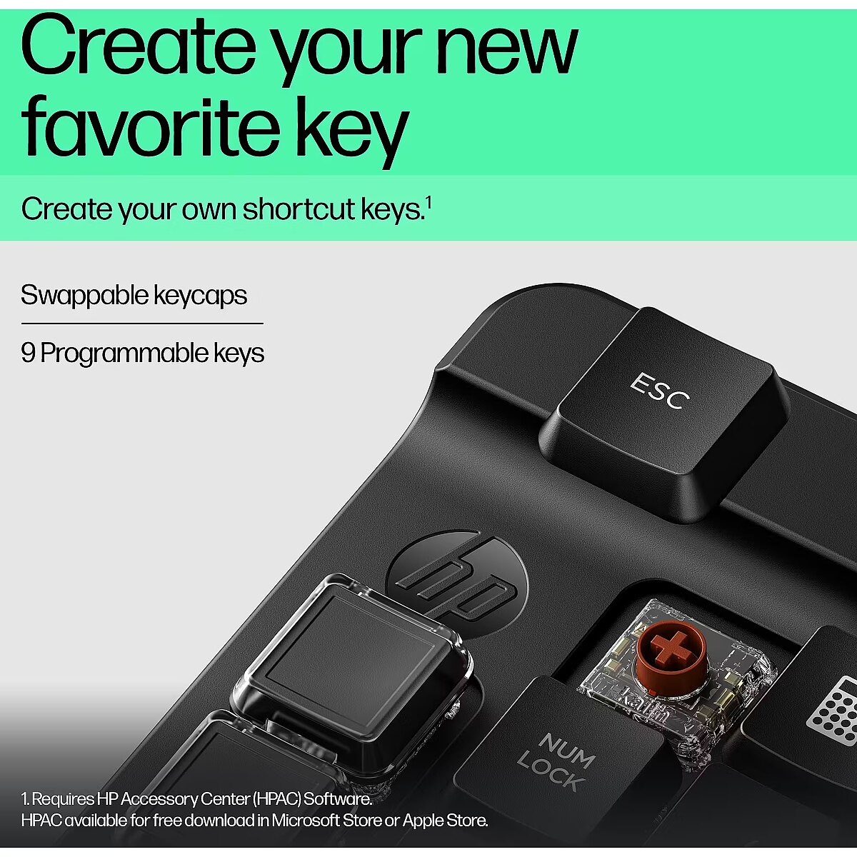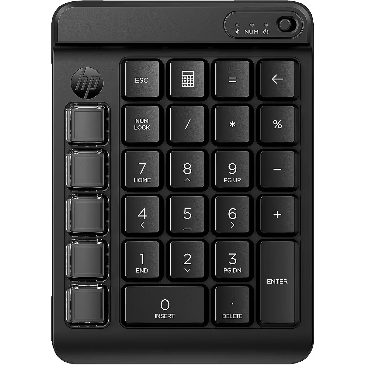 LongDesc - Complete control. Completely customizable.Get more than numbers out of your keypad. The HP 430 Programmable Wireless Keypad is fully customizable[1], to give you full control. Besides the standard numpad layout, a column of five blank keys can be configured as you see fit. In fact, this keypad has nine programmable keys with swappable keycaps for an endless array of workflow options.