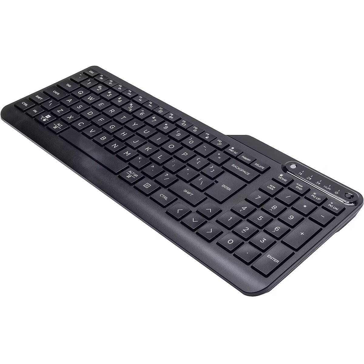 Get the most out of your day, every day. This adjustable, spill-resistant Bluetooth keyboard fits the full keyboard experience into a compact, on-the-go design that saves space in your bag or anywhere you set up. Add utility and comfort to whatever youre doing with a full numpad, directional keys, and concave keycaps that make typing quiet and comfortable.