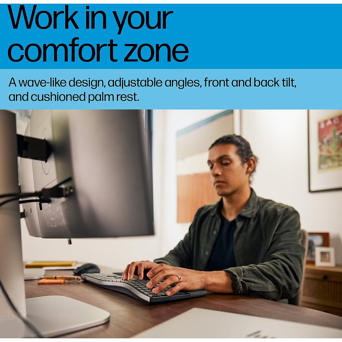 Make any long day feel easier with this comfort-first keyboard. Its wave-like shape, adjustable typing angles with front and back tilt, and cushioned palm rest help you power through even the hardest days with features built to keep you at your best.