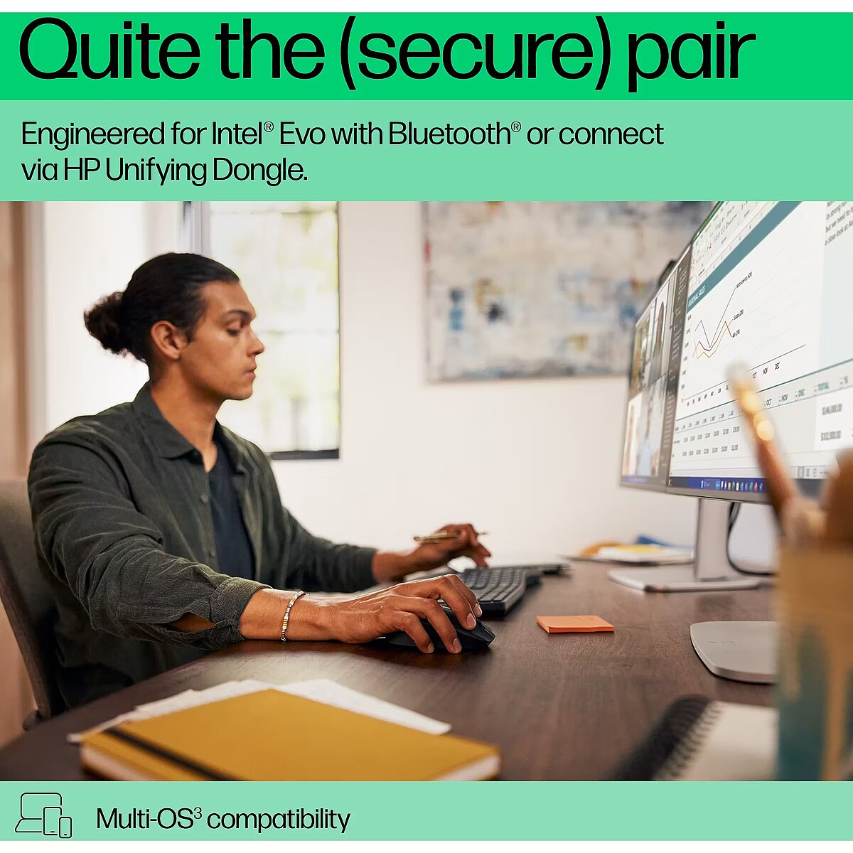 Be secure in knowing this dual-mode keyboard and mouse syncs to multiple devices worry-free. Seamless Bluetooth and dependable HP Unifying Dongle protect everything you connect. Engineered for Intel Evo devices and multi-OS compatibility for smoother, safer workflow on the fly.