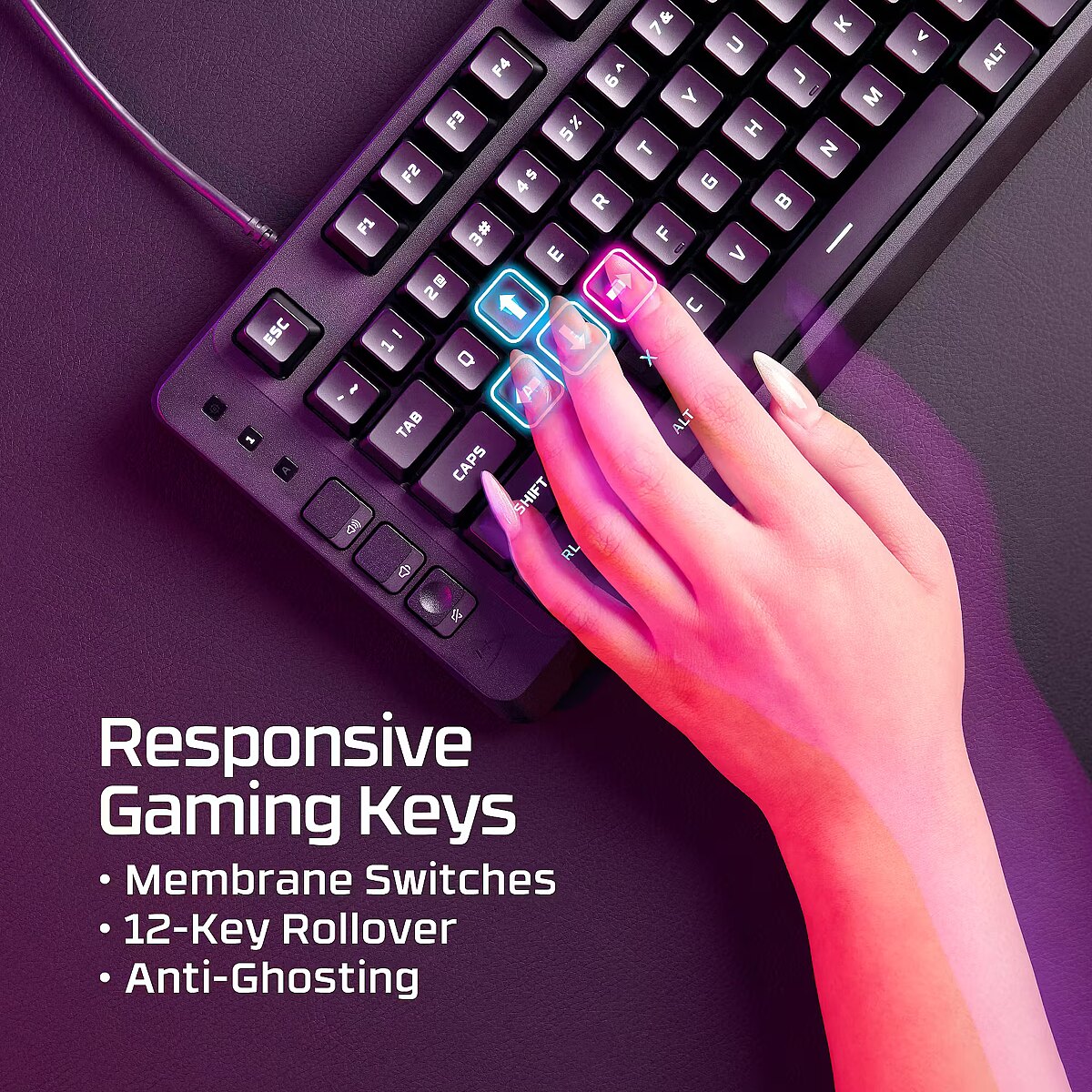 The HyperX Eve 1800 Gaming Keyboard is a compact gaming keyboard that gets you started right. With its condensed layout, you get more desk space for your mouse, microphone, and headset. Enjoy 10 zones of customizable, dynamic RGB lighting and turn your keyboard into the perfect accessory for your PC. Beyond lighting effects, this budget-friendly keyboard delivers style and performance in a sleek design with convenient media buttons. It features anti-ghosting and 12-key rollover, so your keypresses register exactly when they need to. Plus, the membrane switches deliver satisfying, cushioned keypresses that won't disturb you while you play. After all, this is the eve of your gaming adventure.